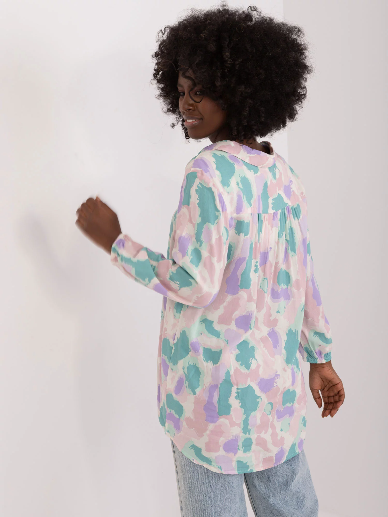 Rozměry halenky ve velikosti S měřené na plocho: šířka v podpaží - 50 cm, délka rukávu - 48 cm, celková délka (vpředu)- 61 cm, celková délka (vzadu)- 70 cm.