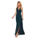 Šaty jsou ušité ze vzdušného materiálu v lahvově zelené barvě. Model se zapíná vzadu skrytým zipem. Tyto šaty značky Numoco jsou polským výrobkem.