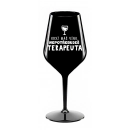 KDYŽ MÁŠ VÍNO, NEPOTŘEBUJEŠ TERAPEUTA - černá nerozbitná sklenice na víno 470 ml