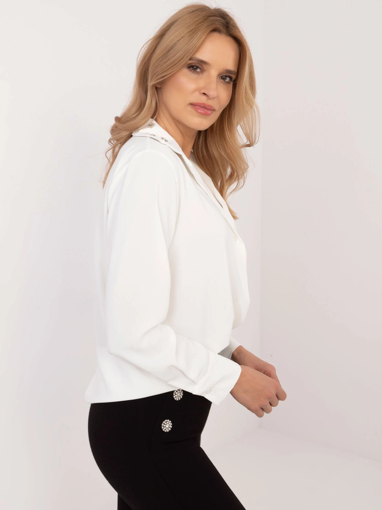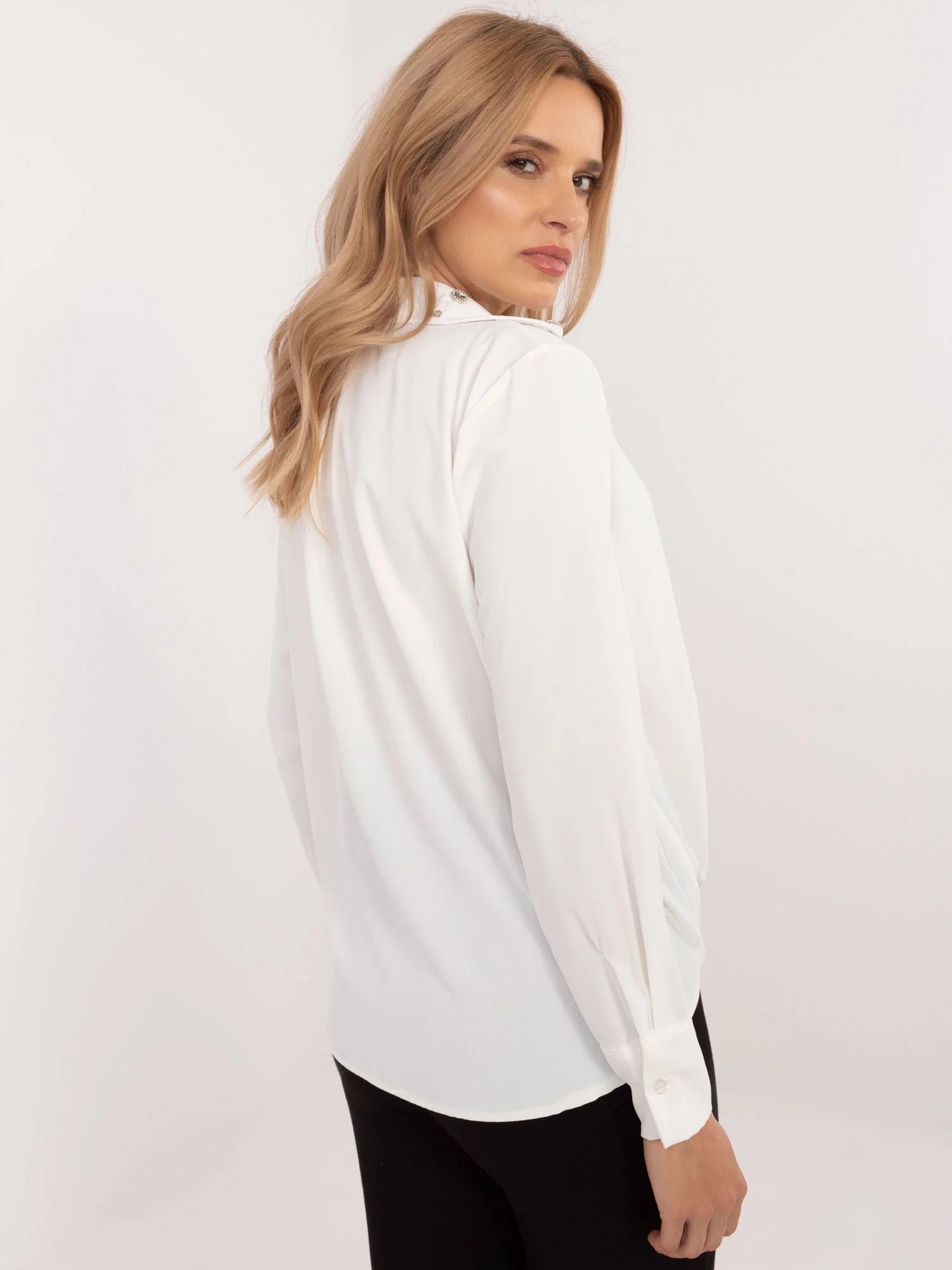 Padavá dámská košile, ve přední spodní části na gumu, vepředu sešitá. Zapínání na jeden knoflík.