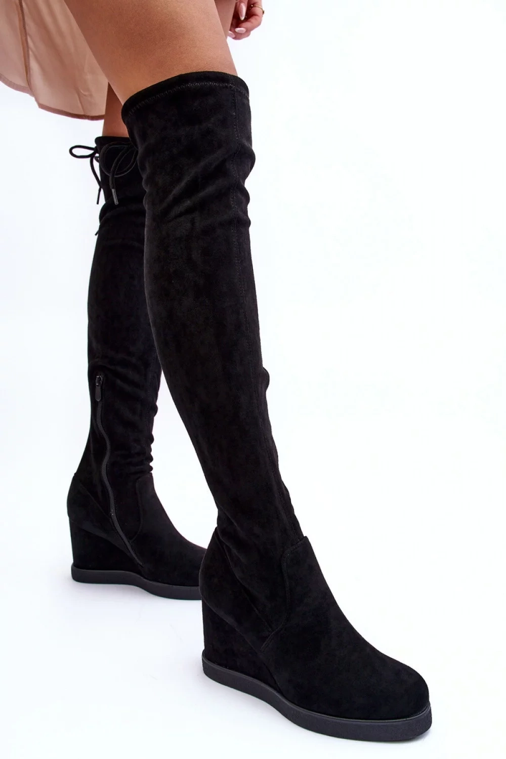 Dámské boty s vázaným svrškem za kolenem. Nazouvací model, s dodatečným zipem na boku svršku. Osazené na platformě a podpatku. Zateplení ve výšce chodidla. Podpatek je vyztužený. Tento jedinečný střih potěší každého!