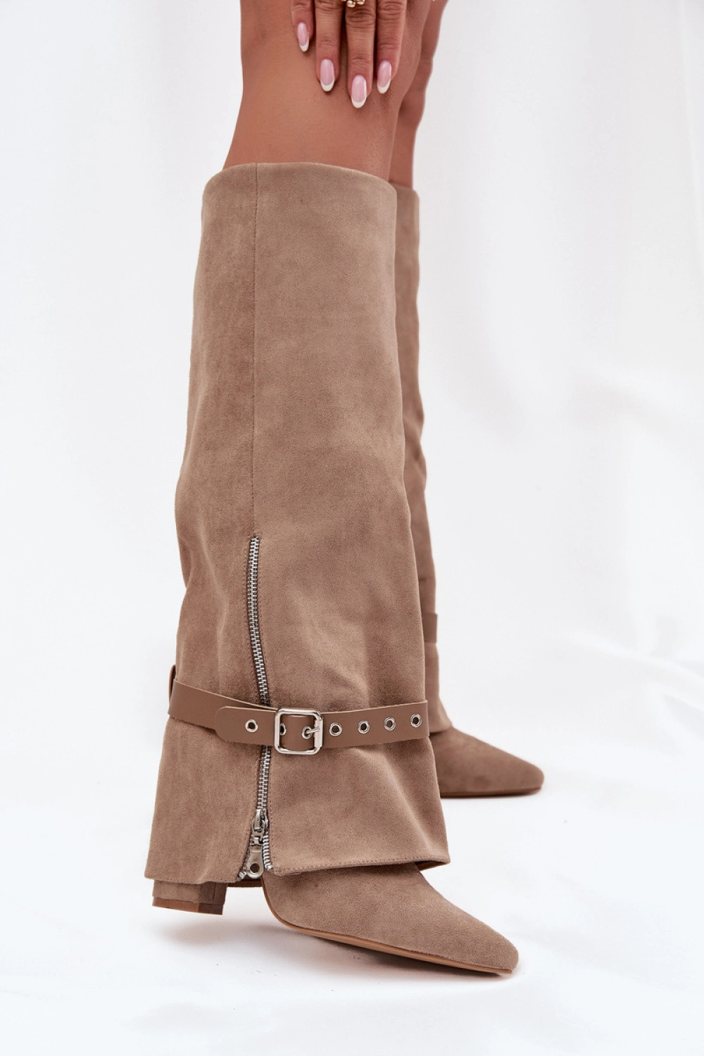Dámské boty byly vyrobeny z ekologického semiše. Stojí na plochém podpatku. Svršek před kolenem. Zao