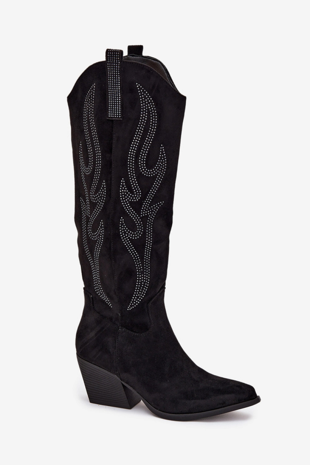 Dámské kozačky z ekokože, osazené na sloupcovém podpatku, jsou stylovým návrhem na chladnější dny. Svršek sahá až po kolena, co jim dodává klasický vzhled, a ozdoby jim dodávají jedinečný charakter. Špičaté špičky opticky zjemňují nohy, a model se zavíraním na zip na spodní části boty zajistí pohodlí a snadné obouvání. Skvěle se hodí k elegantním i volným stylizacím, ideální na zimní výlety.