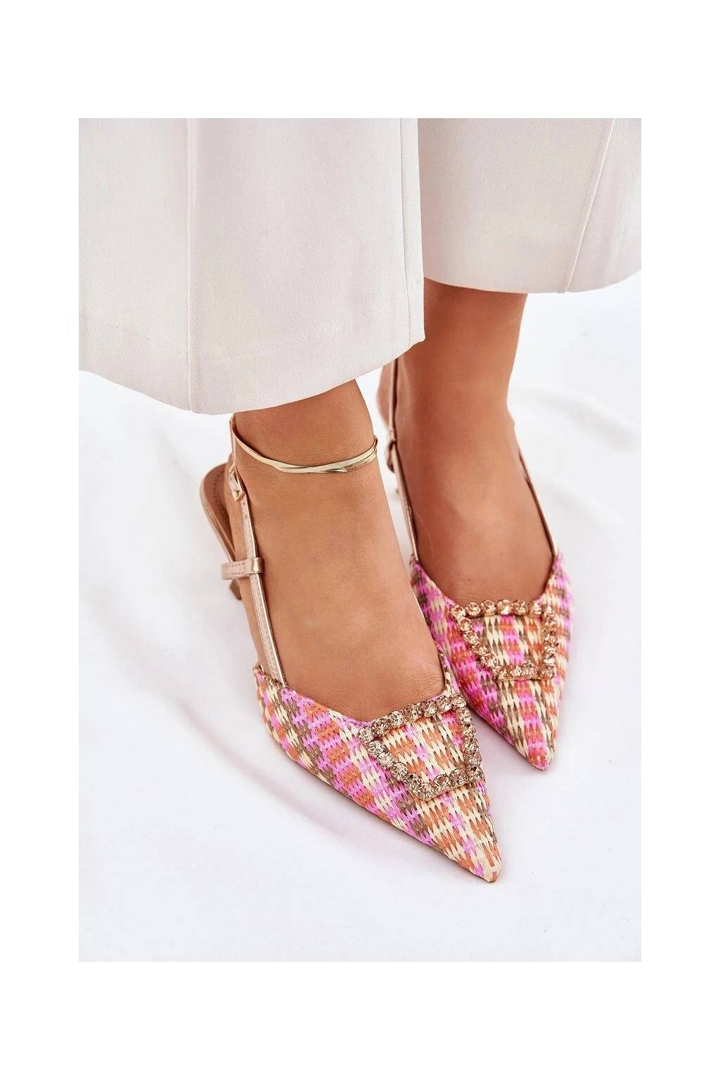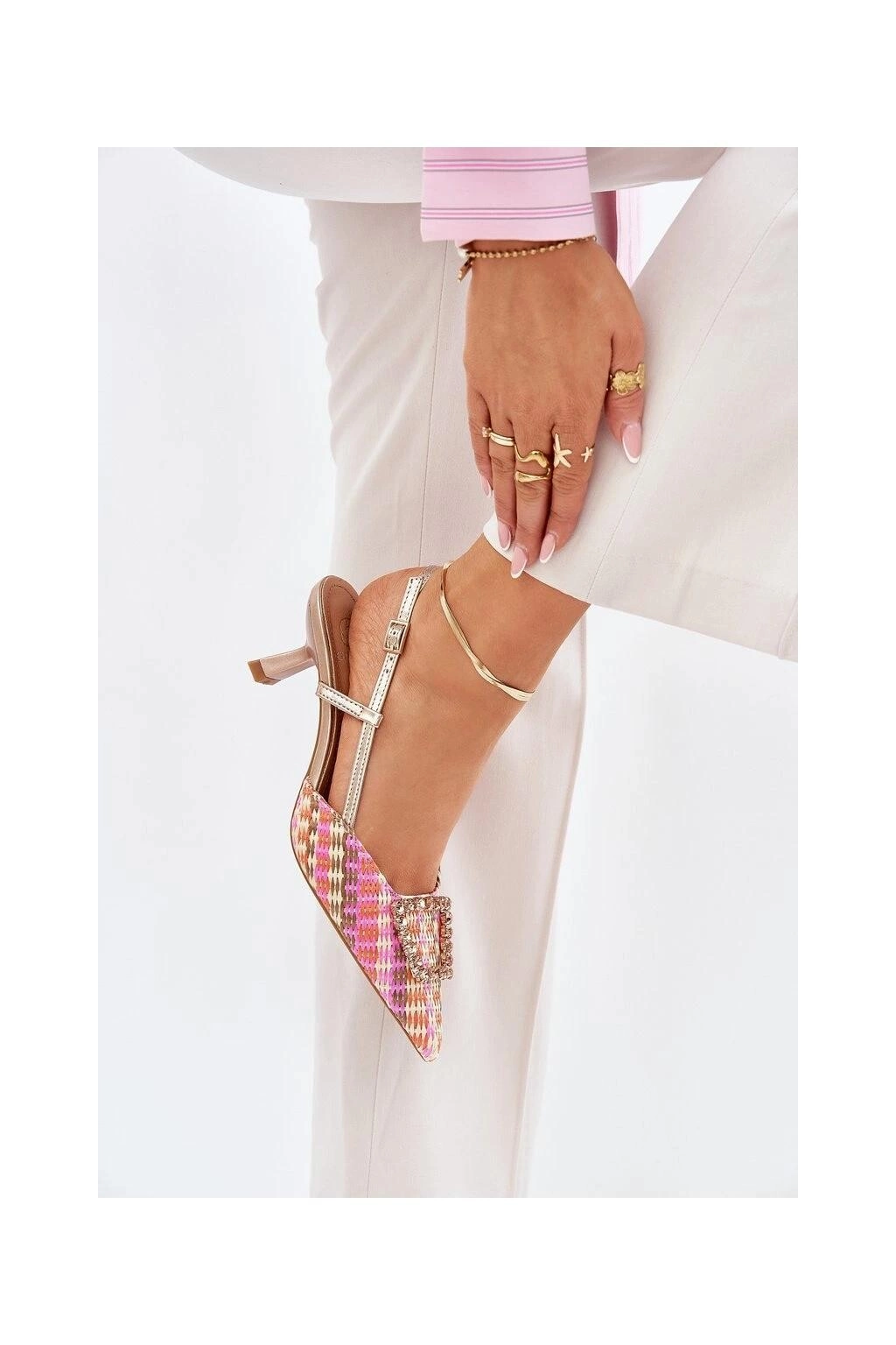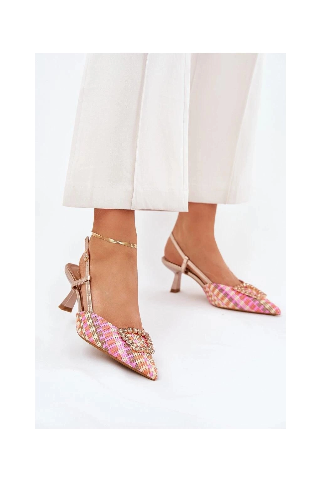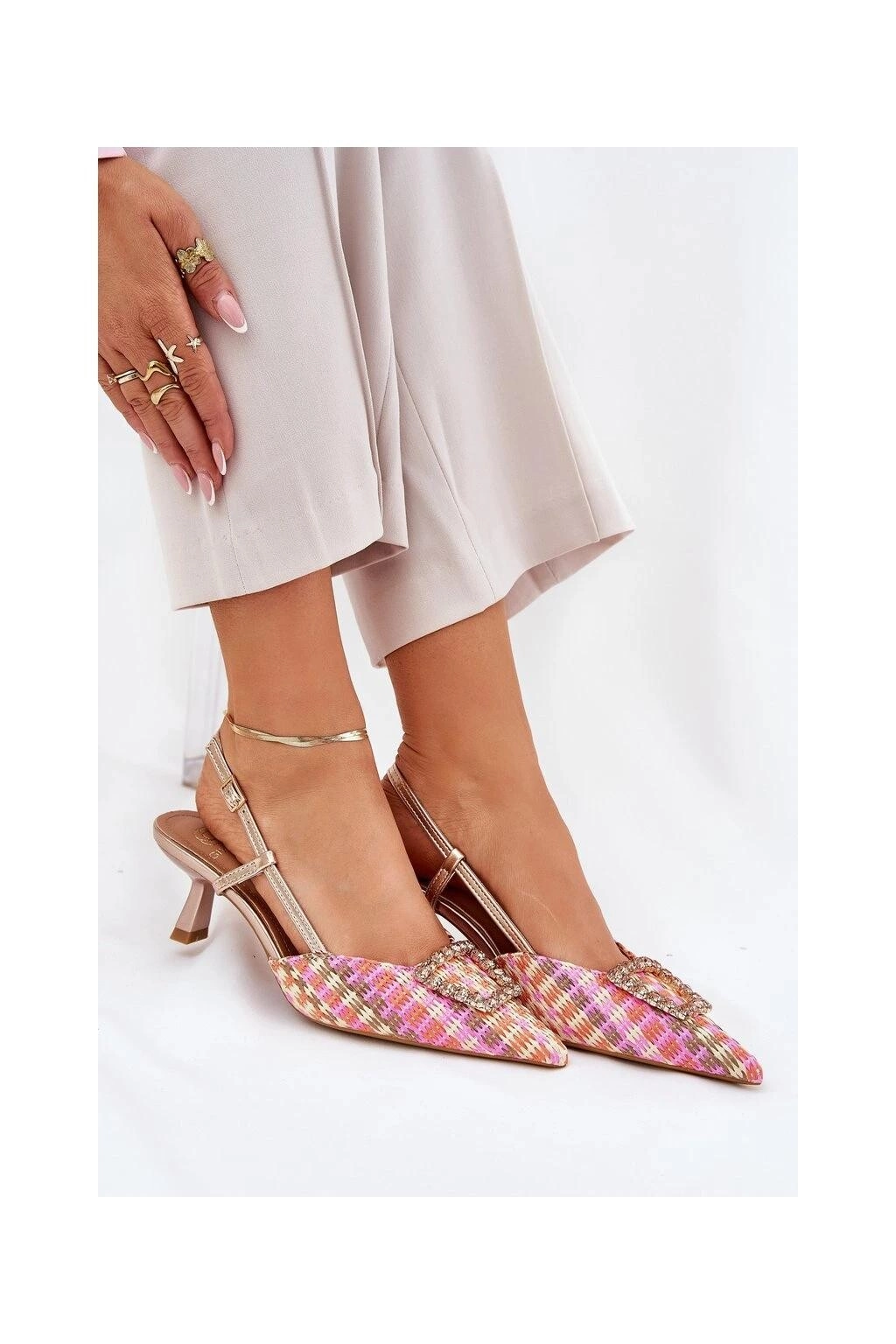 Dámské lodičky s odkrytou patou, které okouzlí svým vzhledem. Model s špičatými špičkami opticky prodlužuje nohy a ozdoba vpředu jim dodává zvláštní šarm. Zapínání na nastavitelný pásek s přezkou zajišťuje pohodlí a skvělé přizpůsobení. Ideální volba pro večerní výlety a speciální příležitosti.