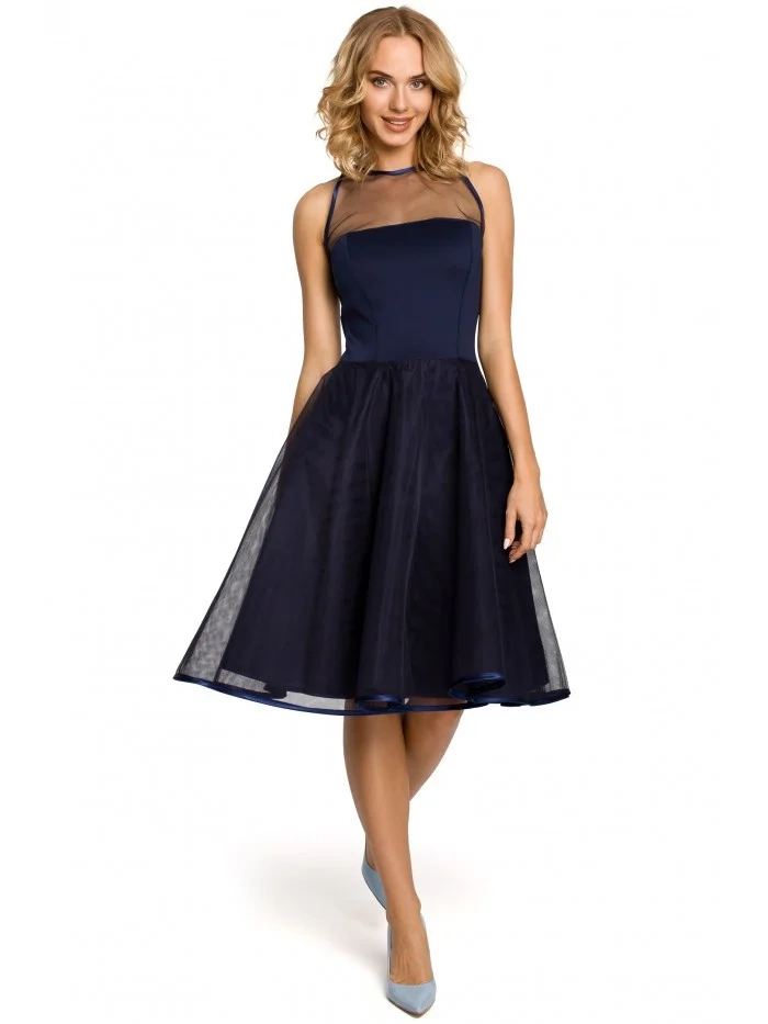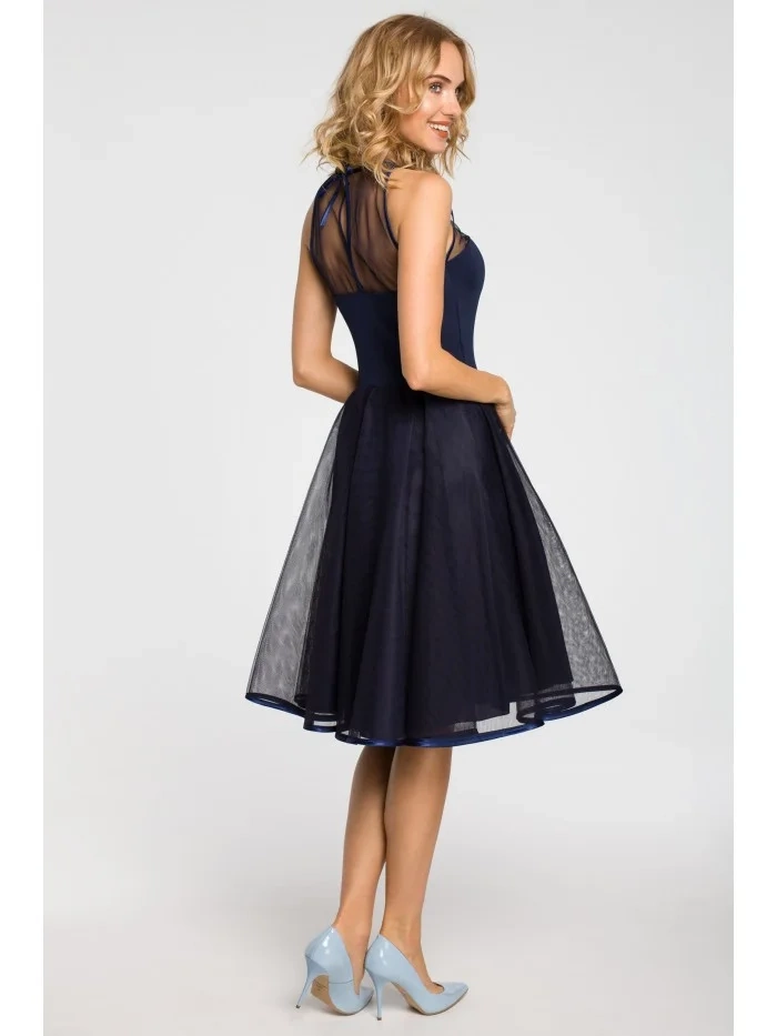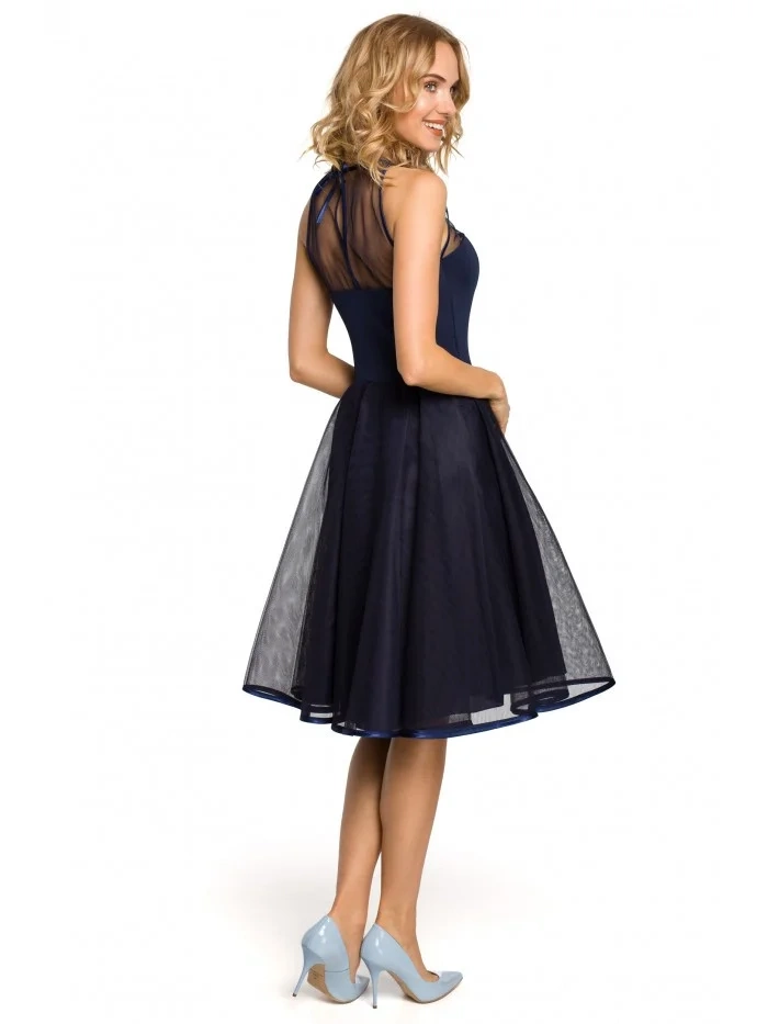 Večerní šaty ke kolenům se síťovaným sedlem a sukní. Šité detaily a zavazování na zádech s klíčovou dírkou.