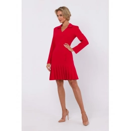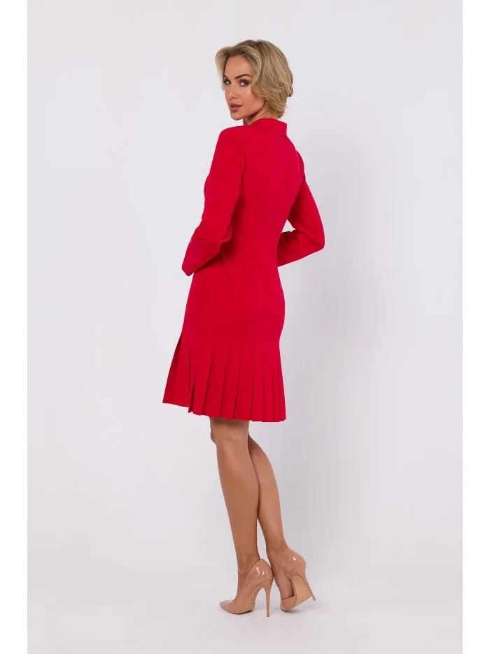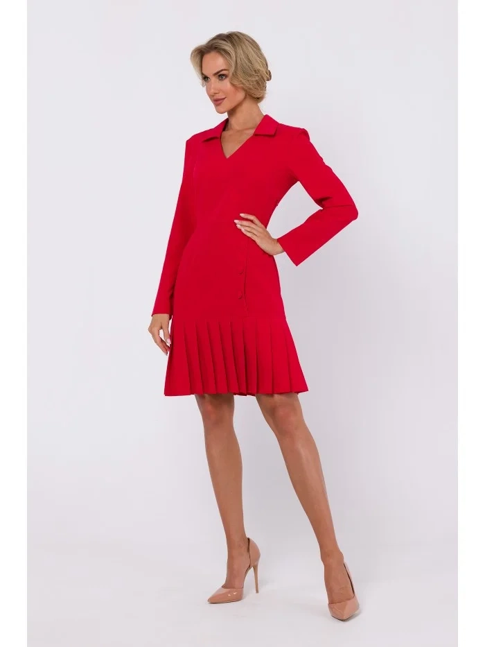 INFORMACE O PRODUKTU: pouzdrové šaty z tkané látky s límečkem a plisovaným spodním lemem výstřih do V a falešný zábal vpředu ozdobné knoflíky vpředu dlouhé rukávy délka nad kolena skrytý boční zip bez podšívky naše modelka je vysoká 171 cm a nosí velikost S Navrženo a vyrobeno v Polsku