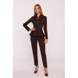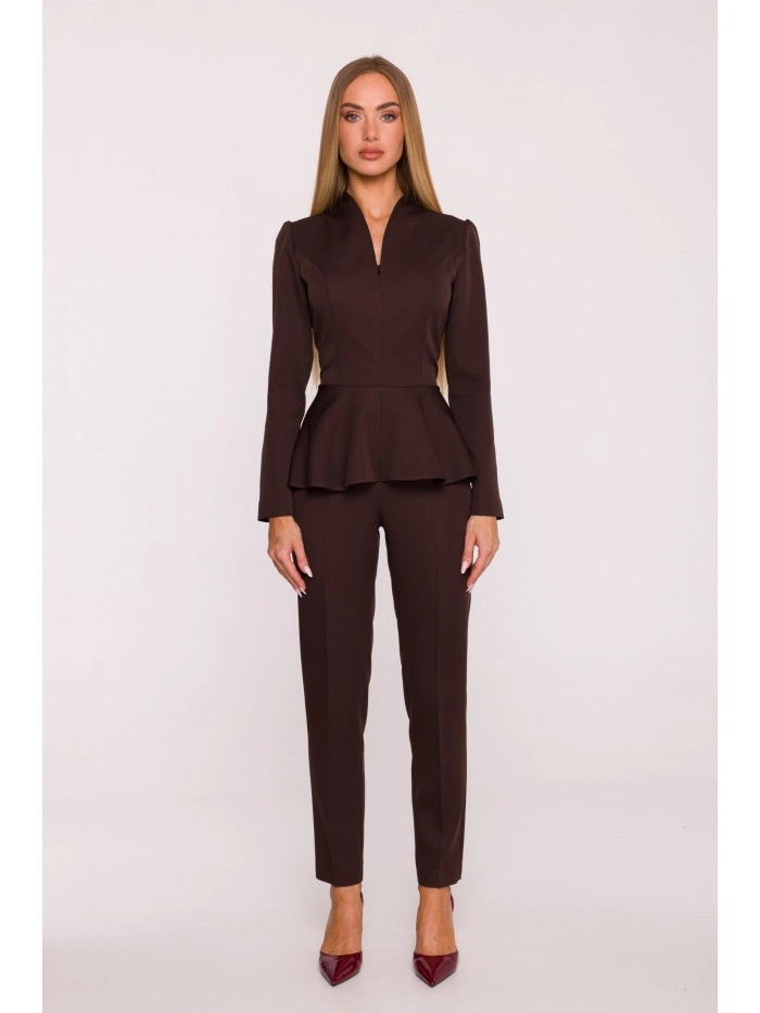 Tkanina: hladká tkanina s matným povrchem PODROBNOSTI O PRODUKTU Výstřih: výstřih do V s nastavitelnou hloubkou Rukávy: dlouhé Zapínání: vpředu na skrytý zip, vzadu na skrytý zip Pas: vypasovaný, zvýrazněný stylovým peplumem Nohy: zúžené směrem k lemu, délka ke kotníkům Kapsy: žádné Podšívka: žádná Model: M878 Navrženo a vyrobeno v Polsku Modelka na fotografii je vysoká 171 cm a má na sobě velikost S STYL A STŘIH Styl: jednodílný overal, vypasovaný v horní části těla, s peplumem zakrývajícím boky, část hýždí a oblast břicha Tvar: zvýrazňující postavu, s peplumem v pase a zúženými nohavicemi