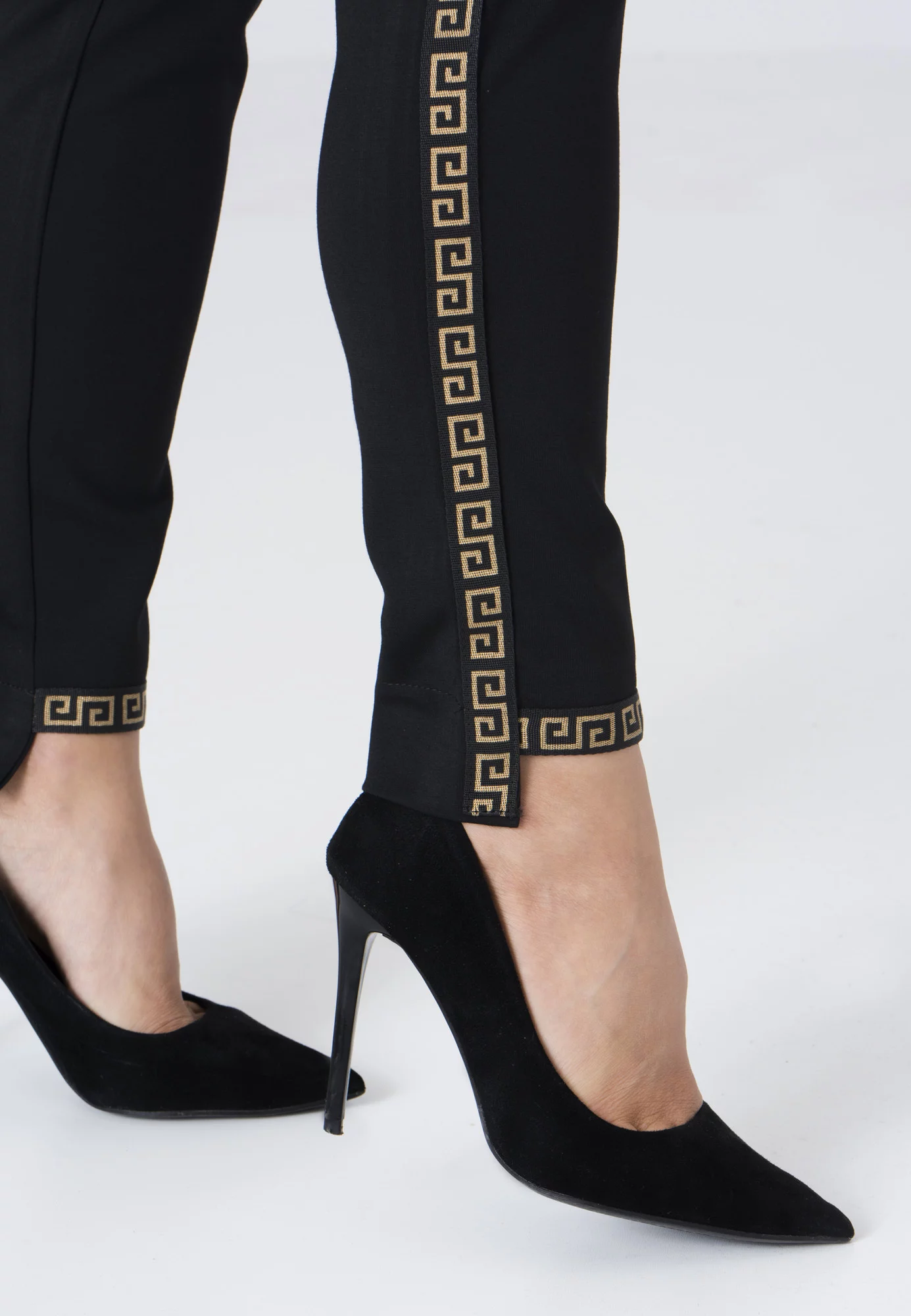 Černé úpletové kalhoty ve fitted střihu. Vysoký pas. Kapsy, asymetrická nohavice, ozdobný pruh.