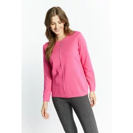Dámský svetr z viskózy z tkaniny příjemné na dotek. Svetr s dlouhými rukávy a půlkulatým výstřihem. Svetr zdobí tři třpytivé aplikace ve výstřihu. Tento model je k dispozici v různých barvách a skvěle doplní každodenní stylizaci. Modelka na obrázku je 177 cm vysoká a má velikost S/M.