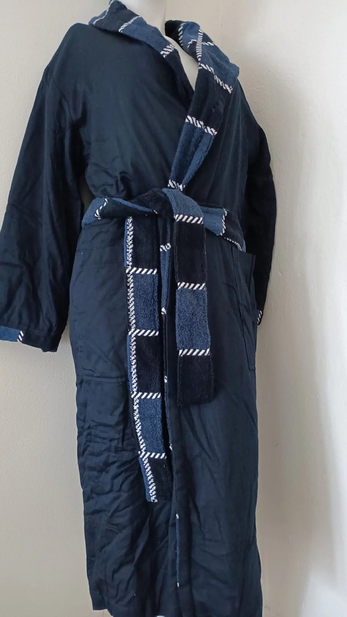 Pánský dlouhý luxusní župan se šálovým límcem . Je ve vzoru tmavě modré a světle modré kostky z vnitřní strany a tmavě modré klasické látky z vrchní strany. Župan je možné obrátit a použít vzorovanou část jako vrchní stranu. V pase na zavazování. Na tmavě modré straně jsou našité kapsy.