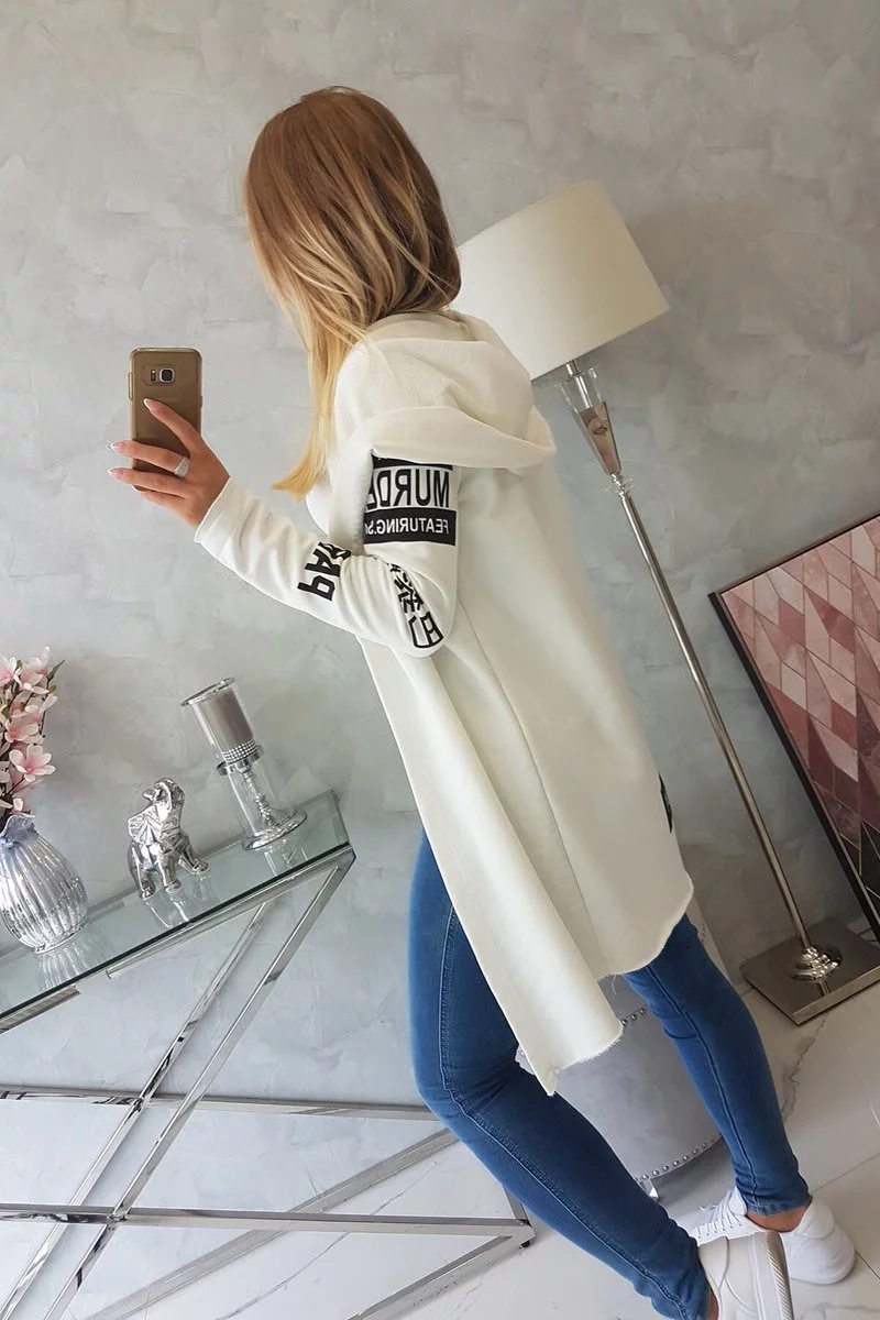 Představujeme vám dlouhou pelerínu s kapucí a nápisy. Svetr je vyroben z vysoce kvalitního materiálu. Velikost je univerzální a bude vhodná pro dámy ve velikostech S, M a L