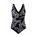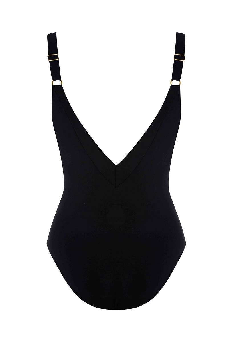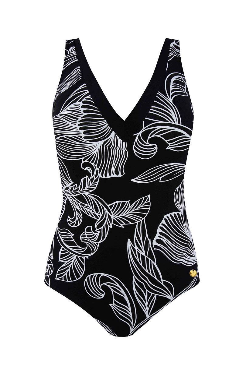 Plavky mají lehce vyztužené vsadky a podprsenku bez kostic pro přirozenou podporu poprsí, zatímco vnitřní tvarující síťovina pomáhá jemně vyrovnávat siluetu pro zeštíhlující efekt. Nastavitelná ramínka umožňují přizpůsobení postavy a hluboce vykrojená záda dodávají smyslný nádech.