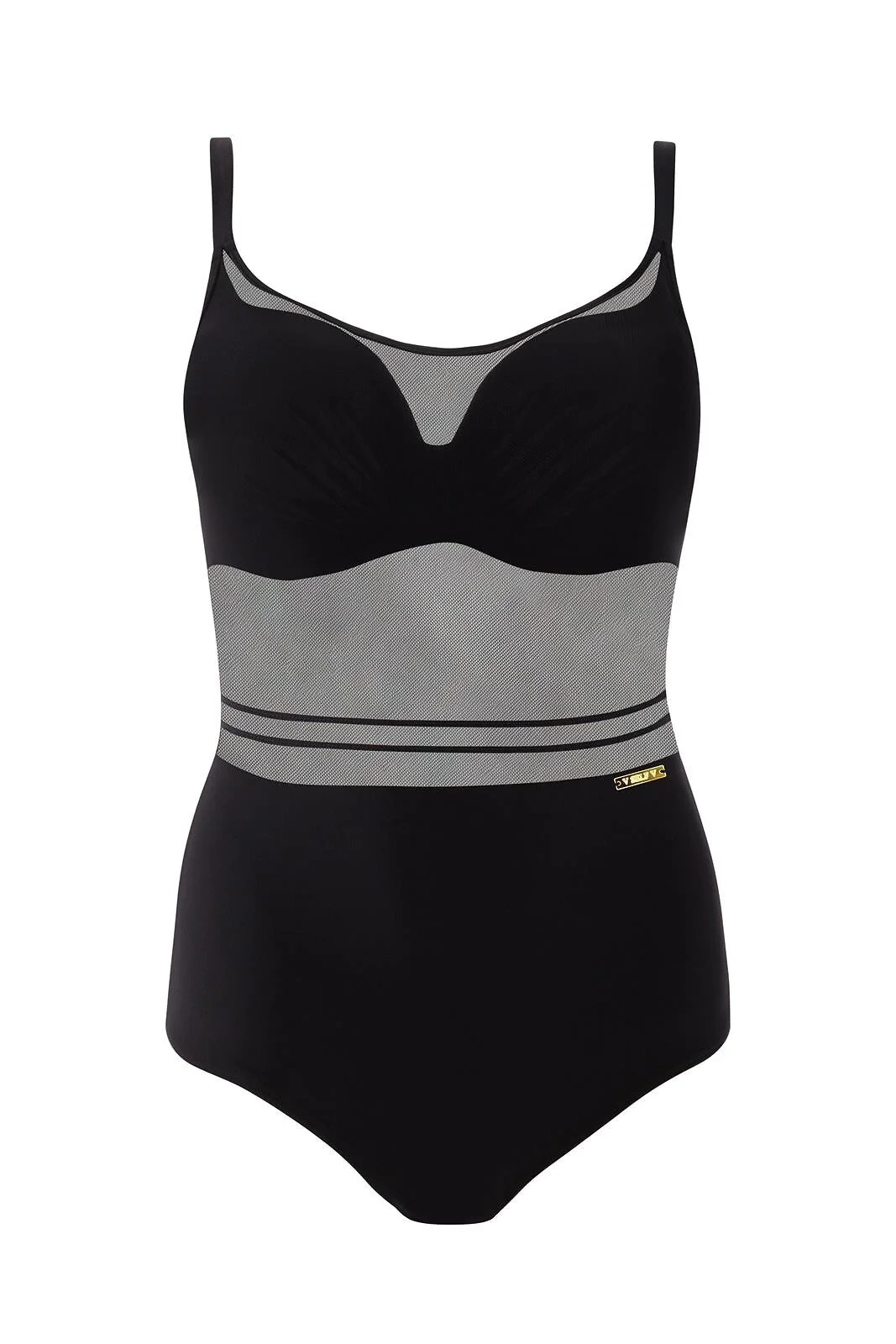 Jednodílné dámské plavky od italské značky Siélei. Plavky mají všitou jemnou podprsenkovou výztuž, která má ve spodní části pružnou gumu. Ramínka mají pevně všitá, nejsou délkově nastavitelná. Vzadu mají hlubší výstřih. Vpředu mají částečné přeložení zužující se směrem do boku s kruhovou aplikací v nejužším místě, plavky tak vizuálně zeštíhlí postavu. Tomu dopomůžou také zlaté svislé proužky a svislé řasení látky. Celé plavky jsou podšity. Materiálové složení: 83% polyester, 17% elastan.
