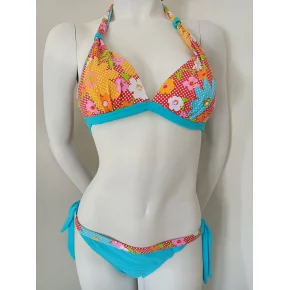 Dámské dvoudílné plavky. Trojúhelníkové vyztužené košíčky, bez kostic. Zavazování za krkem a na záde