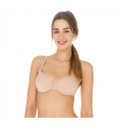 Elegantní dámská podprsenka bez kostic značky Affinitas. Tato vysoce komfortní podprsenka tělové barvy má vyztužené, hladké a jemné košíčky a je velmi přijemná při nošení. Tento model se obzvlášť hodí pod přiléhavé topy nebo šaty. Osvědčený střih zaručí perfektní tvar poprsí, jako by měla podprsenka kostice. Mezi košíčky je drobná saténová mašlička. Ramínka, která mají nápisy značky Affinitas, jsou pevně všita a jsou nastavitelná. Pružný obvod zpevňují boční pružné kostice. Zadní zapínání je na tři pozice a dva háčky. Materiálové složení: 84% nylon, 16% elastan. Pokud si nejste jisti velikostí vaší podprsenky, přečtěte si prosím výše uvedený článek: "Jak určit správnou velikost". Pro přesnější orientaci vaší velikosti podprsenky doporučujeme použít přiloženou velikostní tabulku. Správnou velikost této podprsenky můžete objednat v EU nebo UK značení s ohledem na to, na kterou jste zvyklí a která vám vyhovuje. Pokud velikost vybíráte dle podprsenky, kterou máte již doma v šuplíku, objednávejte dle UK velikosti na štítku podprsenky a UK velikosti v e-shopu.