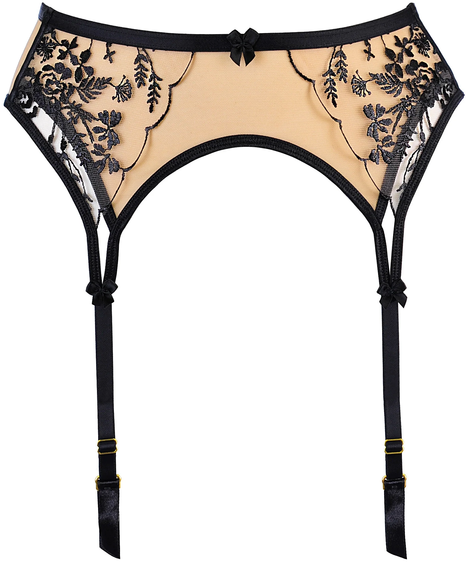 Měkký a decentní podvazkový pás s jemným černým, květinovým vzorem je něžným doplňkem, který promění celý outfit. Dodá mu charakter a šarm, díky němuž se budete cítit smyslně a svůdně. Pás je podšitý nude tylem a je vybaven podvazkovými nástavci, zapíná se výšivkou s dvojitým háčkem. Akcenty a regulátory jsou ve zlaté barvě. Zabudované boční kostice zvýrazňují strukturu. Materiálové složení: polyamid 85 %, polyester 11 %, elastan 4 %