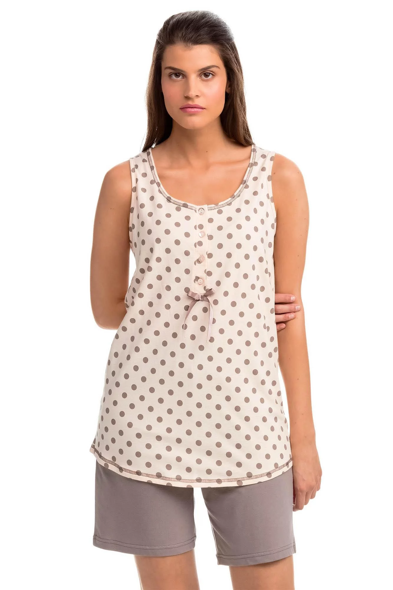 Pohodlné dvoudílné dámské pyžámko pro sladké spaní i pro krásné chvíle. Komplet sestává z košilky s puntíkovým vzorem, který dopňují jednobarevné kraťasy. Toto dámské pyžamo je vyrobené z vysoce kvalitní, genetický nemodifikované 100 % přírodní řecké bavlny, která poskytuje vysoké pohodlí, příjemný pocit na dotek, prodyšnost a odolnost.
