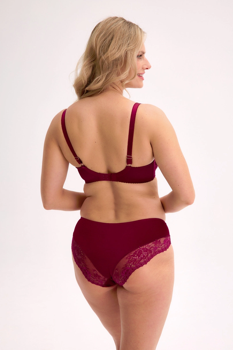 Tato poloměkká podprsenka v tmavě vínové barvě je ideální pro ženy, které si cení elegance a perfektního padnutí. Její design byl pečlivě navržen pro maximální pohodlí a výrazný vzhled – ramínka plynule navazují na vyztužené košíčky a zajišťují pevnou oporu. Důmyslně vyšívaná krajka jemně rámuje košíčky a smyslně se rozšiřuje až k ramínkům, čímž vytváří luxusní vzhled. Tento styl je ideální jak pro každodenní nošení, tak pro zvláštní příležitosti – kdykoli se chcete cítit krásně a sebevědomě.