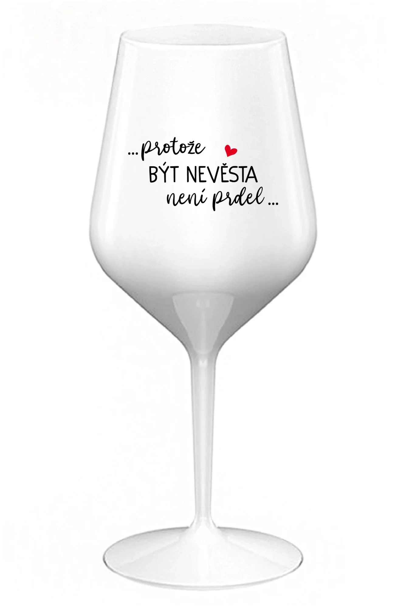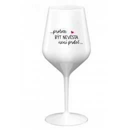 Nerozbitná bílá vinná sklenice s motivem ...PROTOŽE BÝT NEVĚSTA NENÍ PRDEL... je skvělá na zahradu, pláž, výlet, piknik a parádu udělá i při kempování. Jelikož je vyrobená z kvalitního polykarbonátu je de facto nerozbitná. Je to luxusní kousek, s nímž si víno můžete vychutnat prostě kdekoliv. Mají ergonomický tvar, který příjemně padne do ruky a protože je lehká, usnadňuje to její přenášení. Je snadno skladovatelná a lehce se čistí. Díky svému designu si s ní můžete vychutnat doopravdy kdekoliv bezproblémové pití výborného vína.