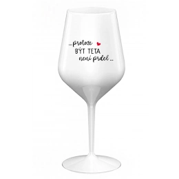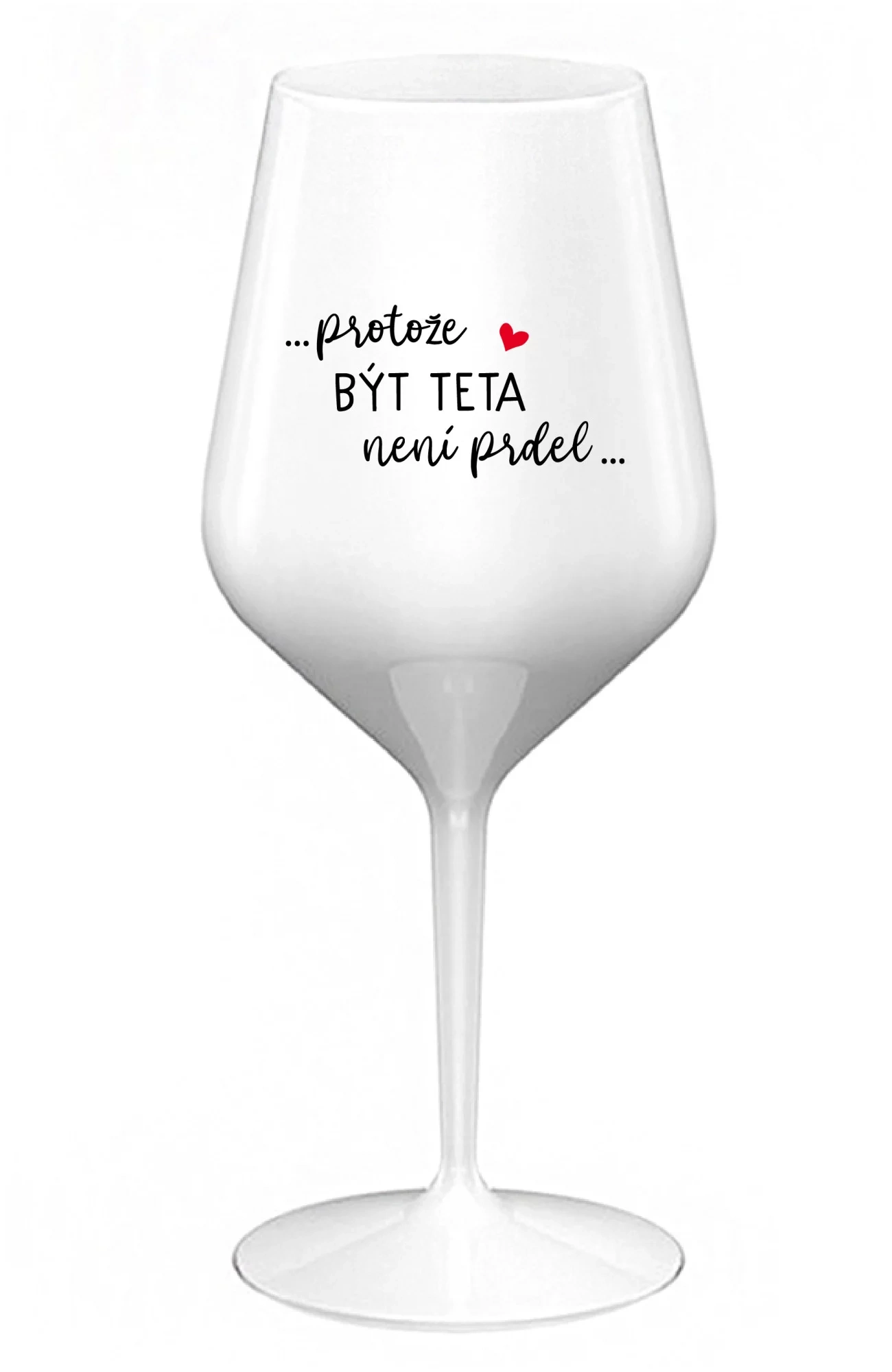 Nerozbitná bílá vinná sklenice s motivem ...PROTOŽE BÝT TETA NENÍ PRDEL... je skvělá na zahradu, pláž, výlet, piknik a parádu udělá i při kempování. Jelikož je vyrobená z kvalitního polykarbonátu je de facto nerozbitná. Je to luxusní kousek, s nímž si víno můžete vychutnat prostě kdekoliv. Mají ergonomický tvar, který příjemně padne do ruky a protože je lehká, usnadňuje to její přenášení. Je snadno skladovatelná a lehce se čistí. Díky svému designu si s ní můžete vychutnat doopravdy kdekoliv bezproblémové pití výborného vína.