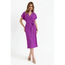 PODROBNOSTI O PRODUKTU: košilové šaty z tkané látky s límečkem zavinovací vršek s krátkými netopýřími rukávy tužková sukně střední délky částečně elastický pas délka pod kolena rozparky na zádech nepodšitý pásek na zavázání naše modelka je 176 cm vysoká a nosí velikost S navrženo a vyrobeno v Polsku