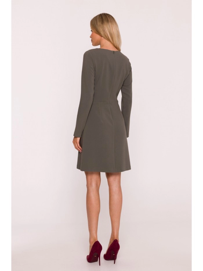 LÁTKA Tkanina: hladká tkanina s jemným povrchem PODROBNOSTI O PRODUKTU Výstřih: zaoblený Rukávy: dlouhé Zapínání: skrytý zip na zádech Kapsy: žádné Detaily: ozdobné záložky v pase se zlatými knoflíky Model: S419 Navrženo a vyrobeno v Polsku Modelka je vysoká 174 cm a nosí velikost S STYL A STŘIH Styl: trapézové šaty, vypasovaný vršek s mírně rozšířenou sukní Tvar: decentní áčková linie Délka: mini, nad kolena