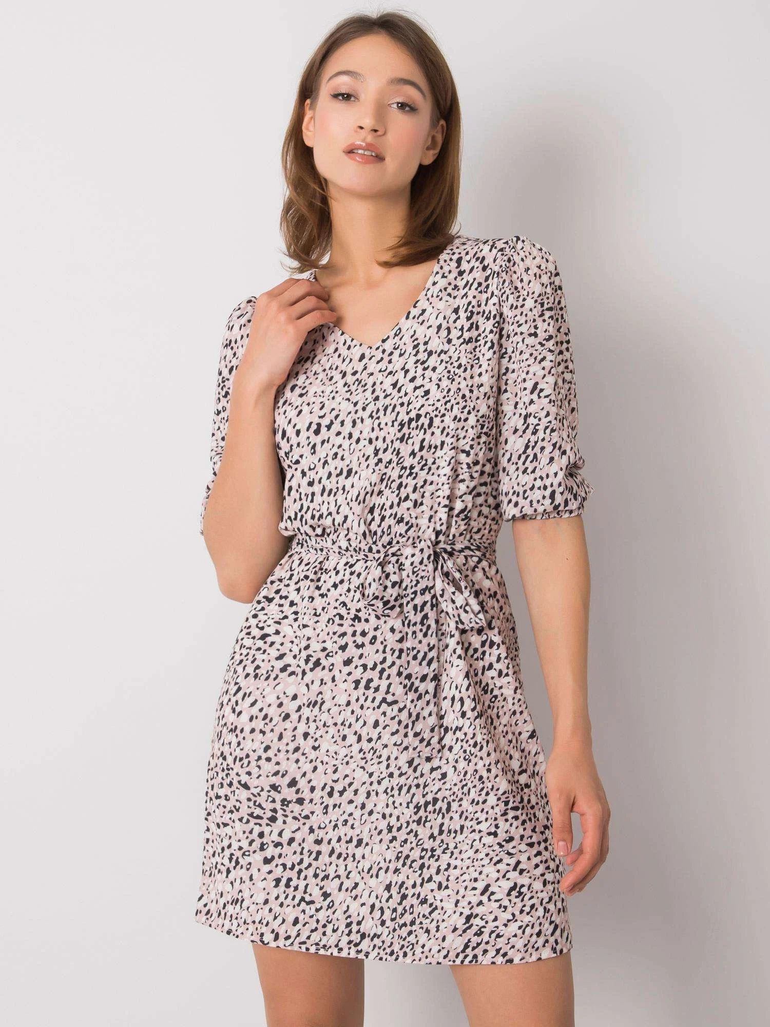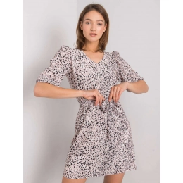 Pudrově růžové vzorované šaty s páskem.