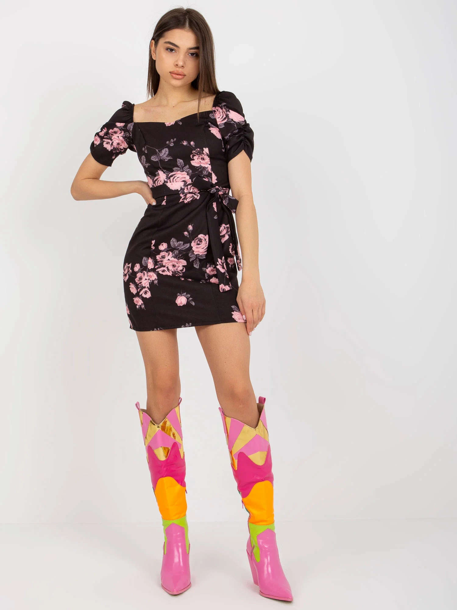 Černo-růžové koktejlové mini šaty s potiskem.