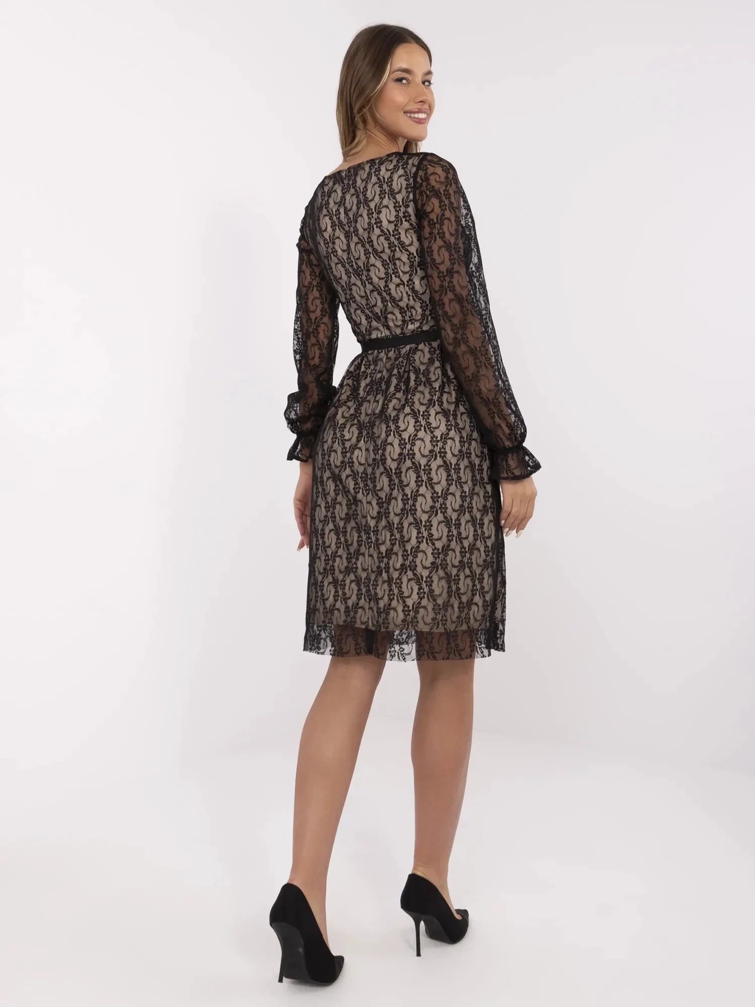 Rozměry šatů velikosti 38 měřené na plocho: šířka v podpaží - 42 cm, celková délka - 104 cm, délka rukávu - 64 cm (od švu).