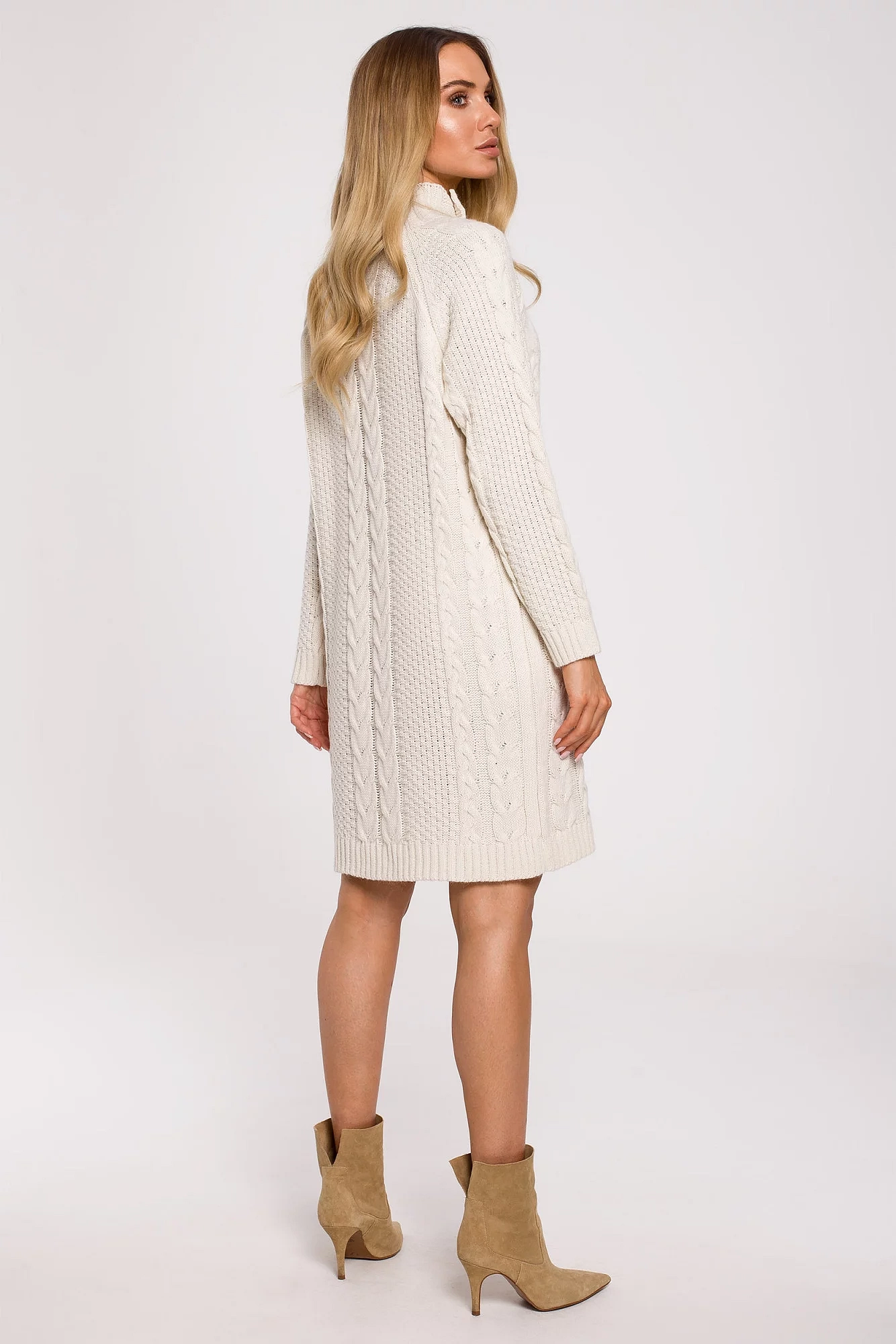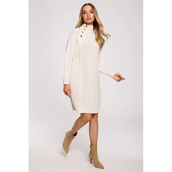 Elegantní a útulné svetrové šaty s ozdobnými zlatými knoflíky ve vysokém límci jsou základem šatníku.