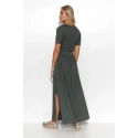 Dlouhé šaty s hlubokým výstřihem. Krátký rukáv, masivní guma všitá v pase.