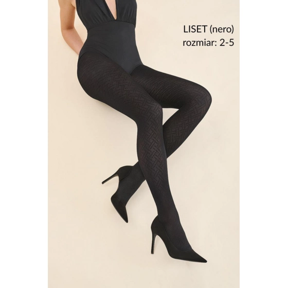 Přidejte svým outfitům třídu a osobitý styl s punčochovými kalhotami Gabriella LISET v tmavě černé barvě (nero). Geometrický kostkovaný vzor je nadčasovým detailem, kterýós zvýrazní nohy a dodá eleganci každému– kancelářskému i večernímu outfitu. 40denní punčochové kalhoty jsou vyrobeny z vysoce kvalitní příze, která zaručuje odolnost, pružnost a pohodlí při nošení. jsou ideální pro podzimní–zimní sezónu a spojují módní vzhled s funkčností.