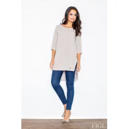 Asymetrická, dámská halenka z nejnovější kolekce podzim-zima Figl. Projekt pro ženy, které ocení uvolněnou eleganci s náznakem sexappealu. Hluboký výstřih vpředu, 3/4 rukávy. komfortní postranní rozparky. Model zamaskuje případné nedokonalosti.