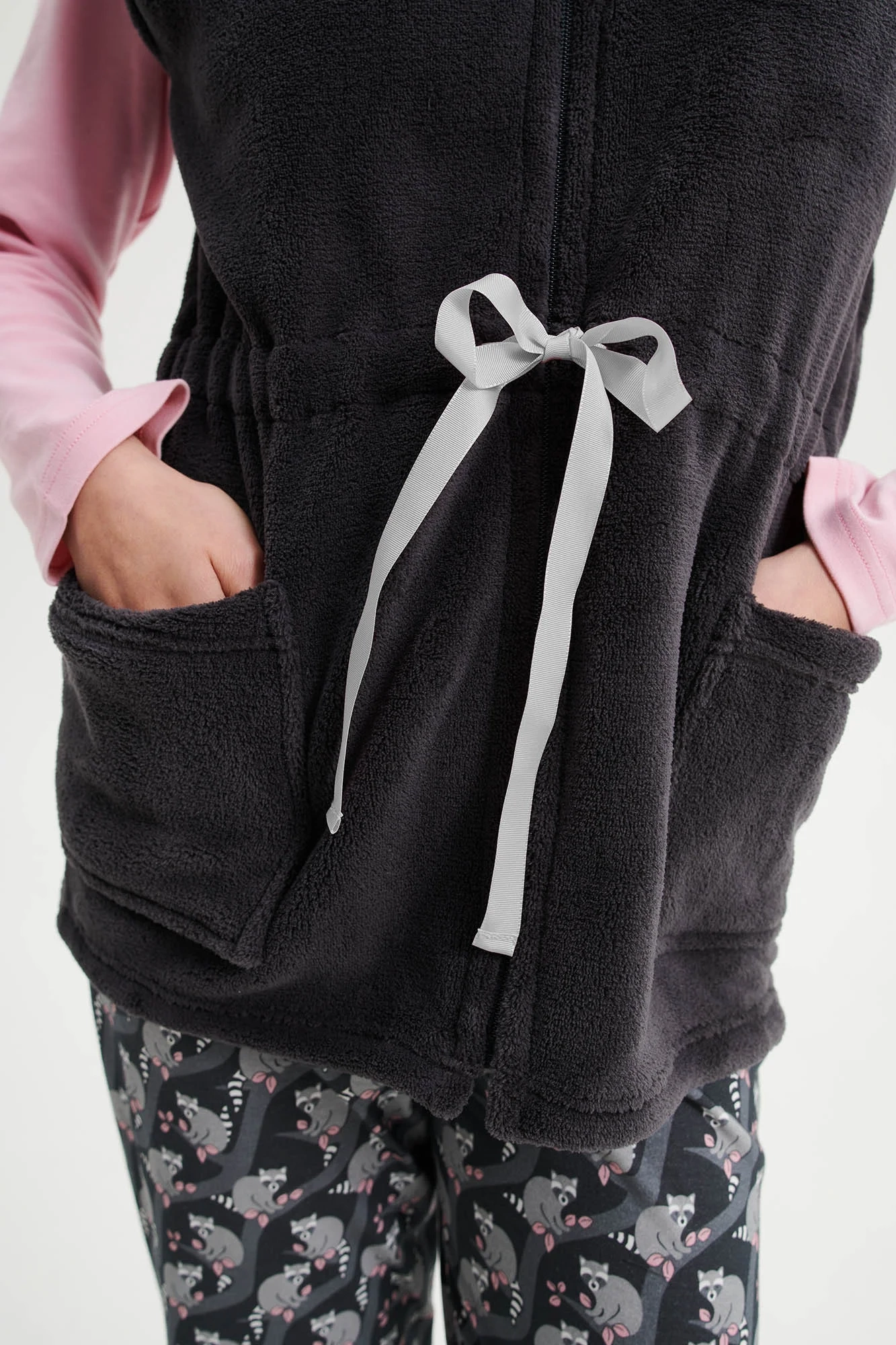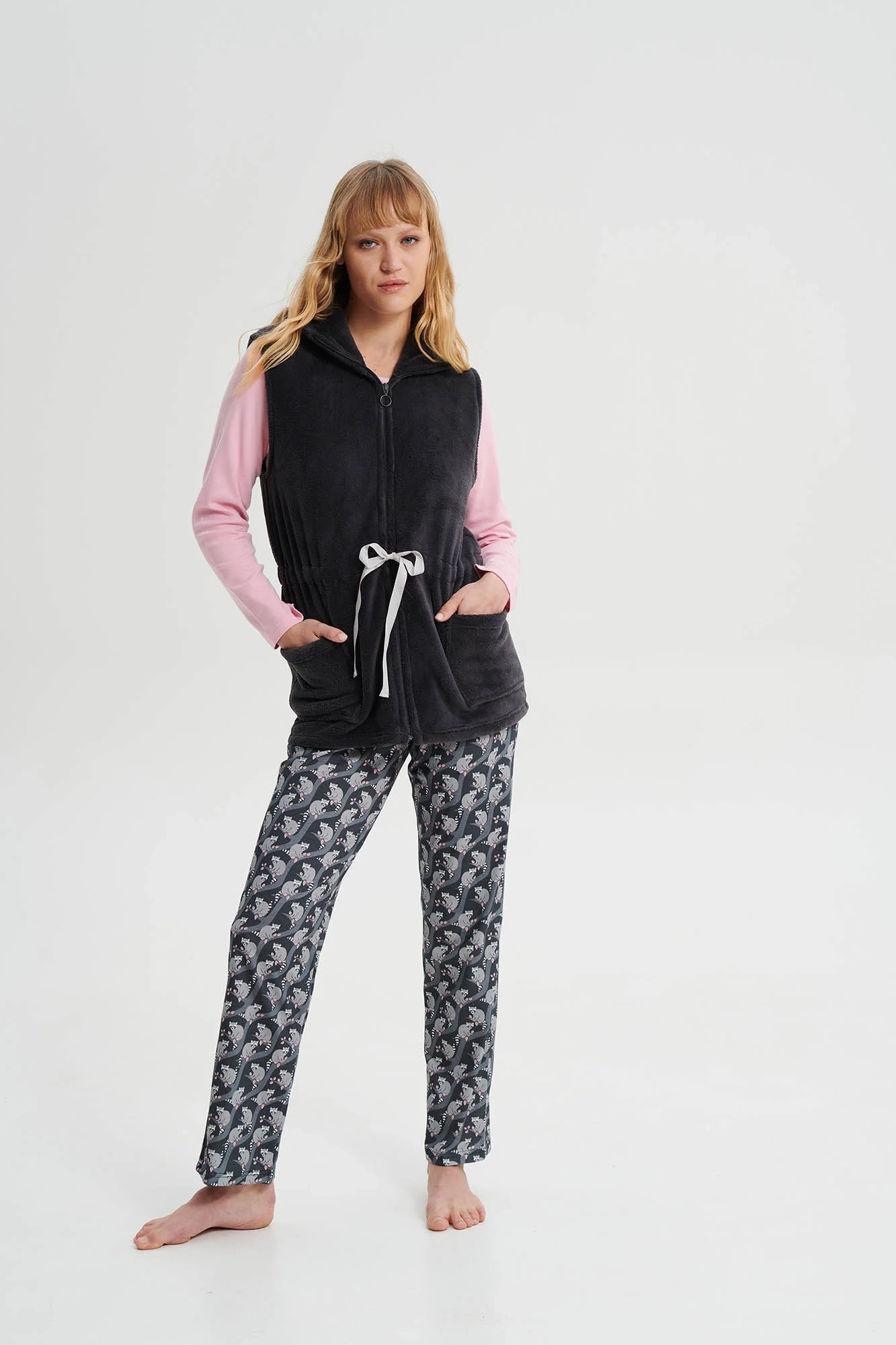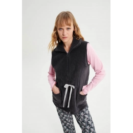 Dámská vesta na zip, s límcem a nastavitelným páskem je vyrobena z tkaniny příjemné na dotek, která poskytne pohodlí a pocit elegance pro chvíle strávené doma.
