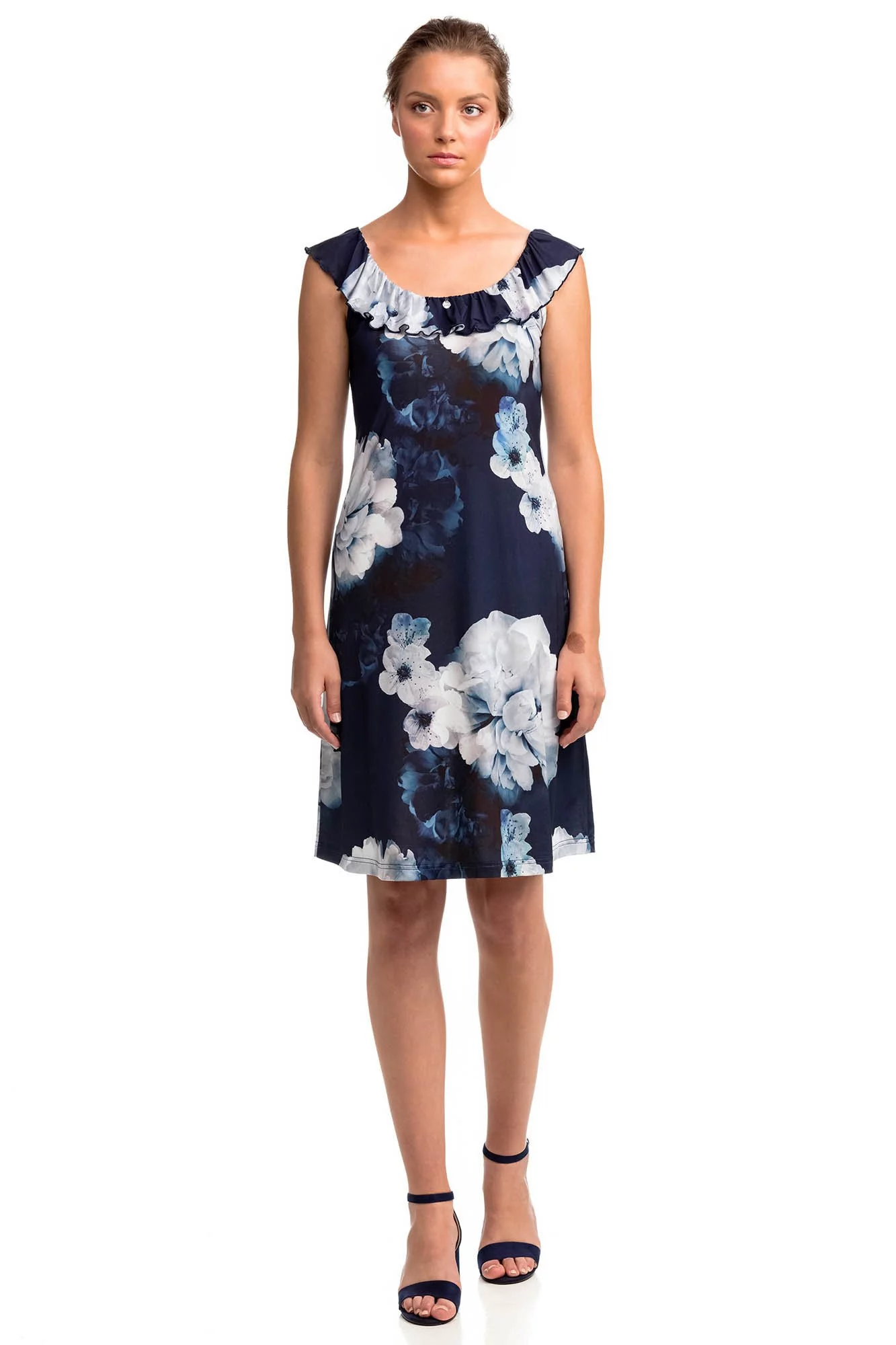 Elegantní dámské květované šaty na ramínka, s kulatým nařaseným výsřihem. Šaty jsou vyrobené z příjemného jersey-polyesteru s příměsí elastanu, které poskytují lehkost, prodyšnost, pružnost i odolnost.