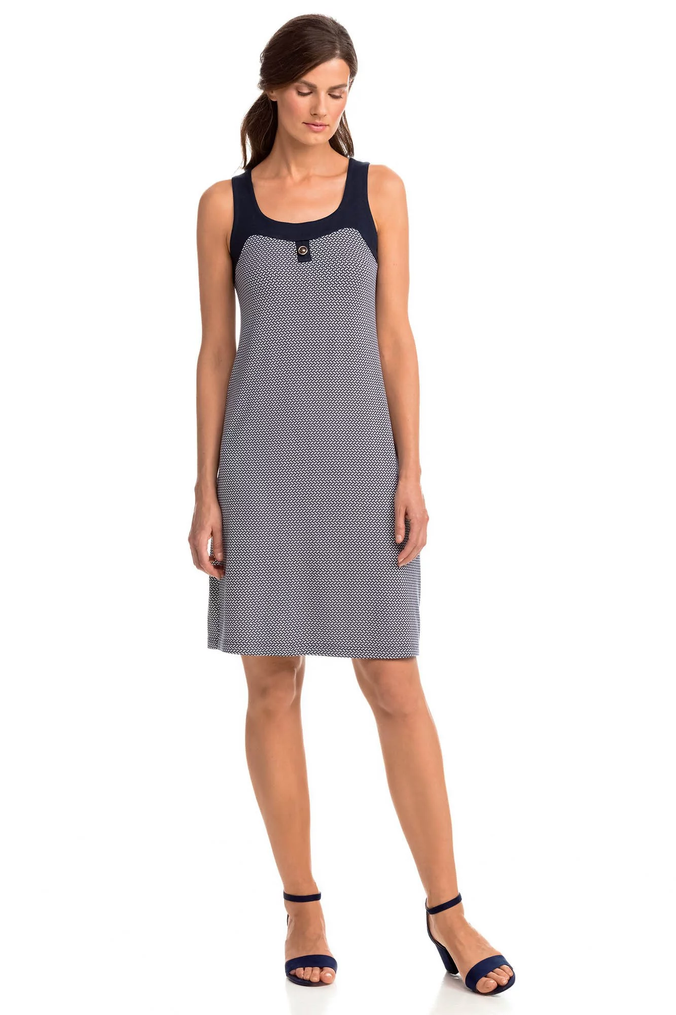 Elegantní vzorované dámské šaty na ramínka s hranatým výstřihem. Šaty jsou vyrobené z kvalitní jersey viskózy s příměsí elastanu. Jersey Viscoza se vyznačuje vysokou savostí, je dobře prodyšná, měkká a příjemná na dotek a elastan zaručuje lepší pružnost tkaniny.
