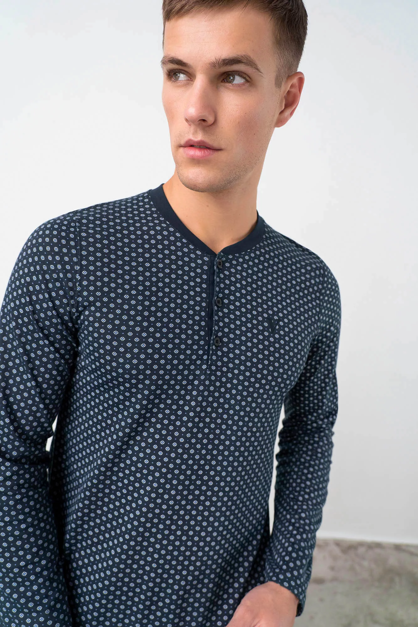 Pohodlné dvoudílné pánské pyžamo pro kvalitní spánek a volný čas. Komplet sestává z trika dlouhým rukávem, výstřihem do V a knoflíkovou légou, který doplňují dlouhé jednobarevné kalhoty. Toto pánské pyžamo je vyrobené z vysoce kvalitní, genetický nemodifikované řecké bavlny, která poskytuje vysoké pohodlí, příjemný pocit na dotek, prodyšnost, pružnost a odolnost.