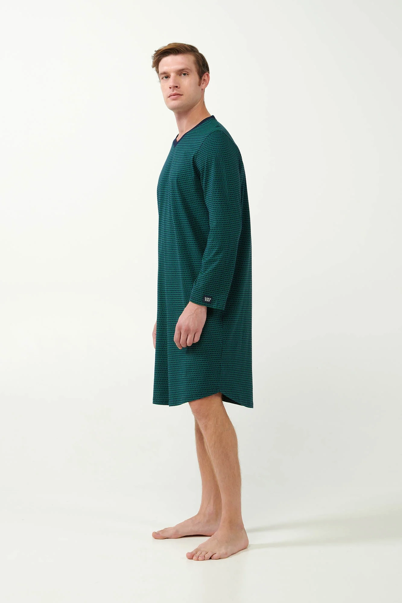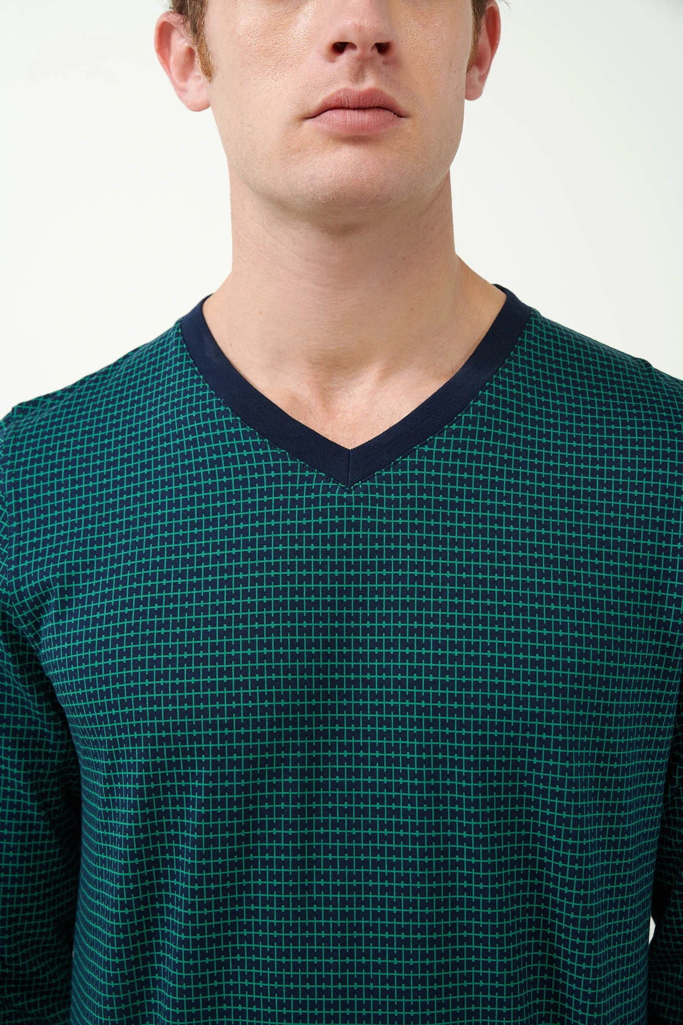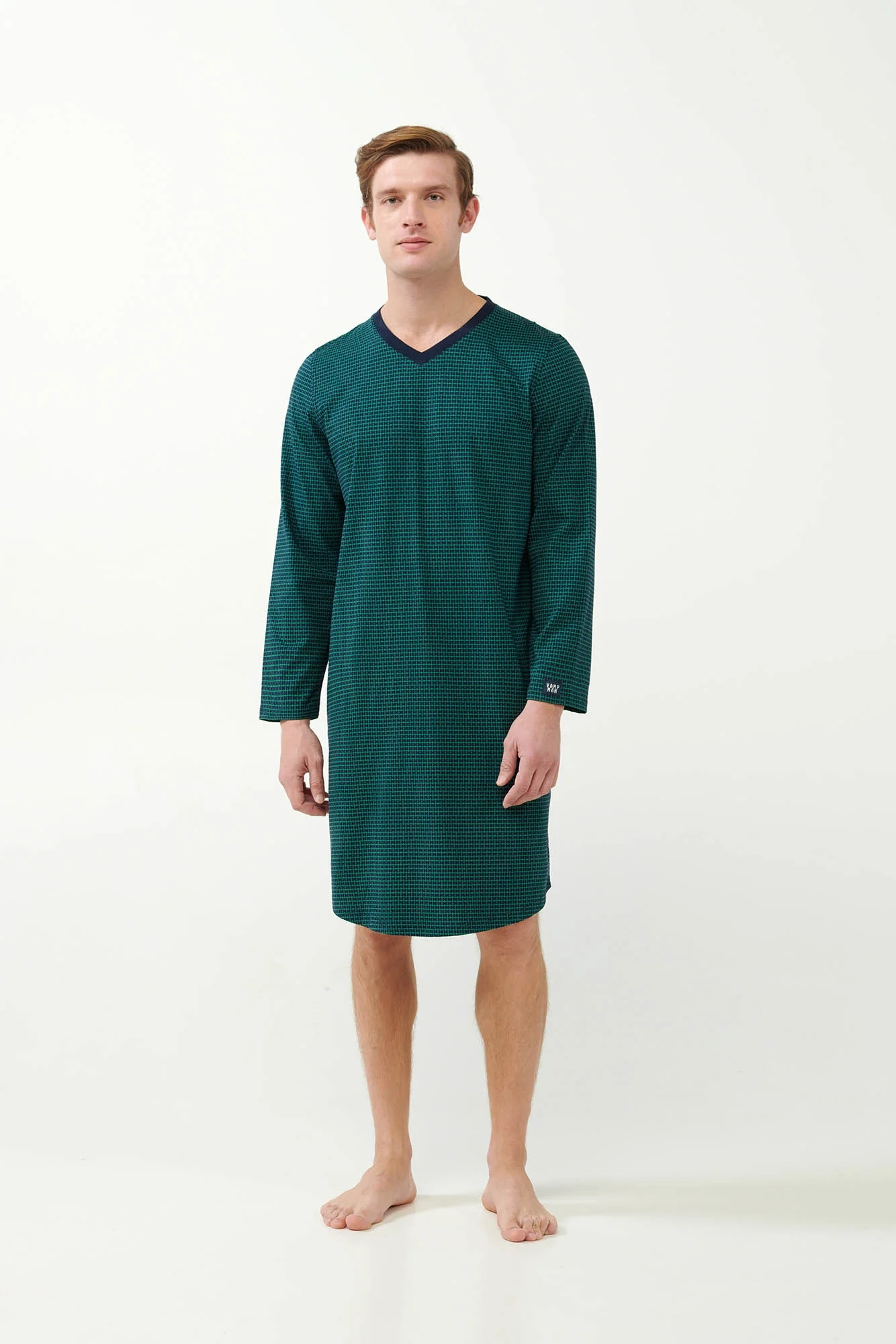 Objevte ztracené umění relaxace s naší pánskou noční košilí s geometrickým potiskem. Tento oděv je vyroben z měkké 100% bavlny typu single jersey a nabízí výjimečné pohodlí a prodyšnost. Výstřih do V dodává košili nádech sofistikovanosti, zatímco uvolněný střih zajišťuje neomezený pohyb. Ideální pro klidný spánek nebo domácí lenošení. Díky nadčasovému geometrickému vzoru a všestrannému designu je vhodná i pro nošení v nemocnici a poskytuje pohodlí a styl během rekonvalescence. Vyzkoušejte dokonalou kombinaci pohodlí staré školy a moderní estetiky.