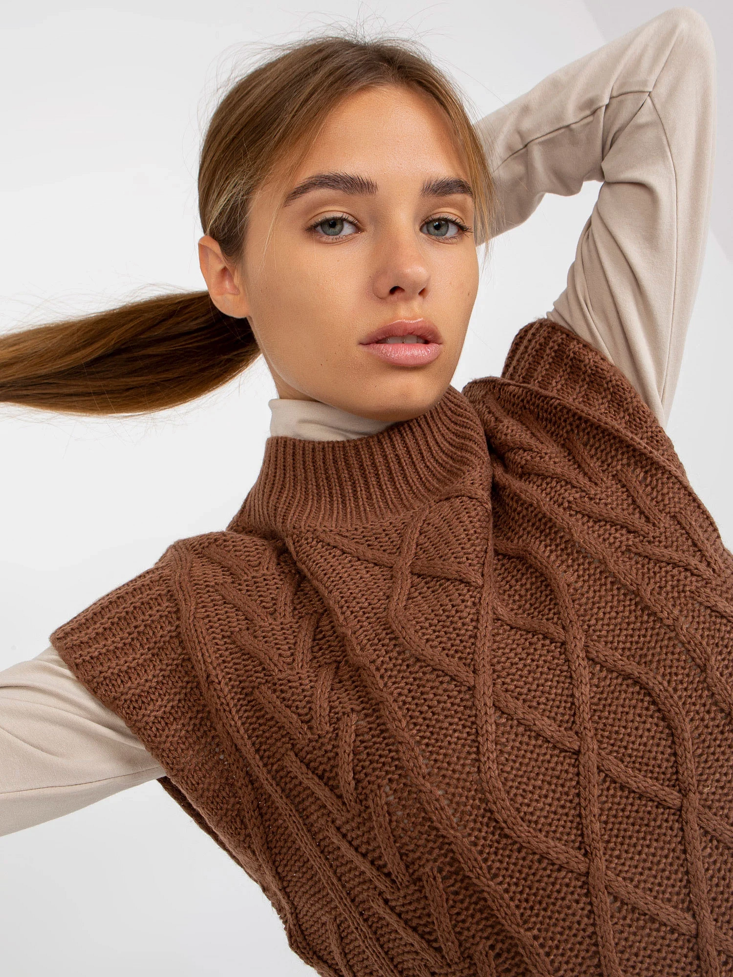 Hnědá pletená vesta s prýmky PODLAHA .   Kód produktu: D90027W90785B2 dominantní vzor: hladký sVíce