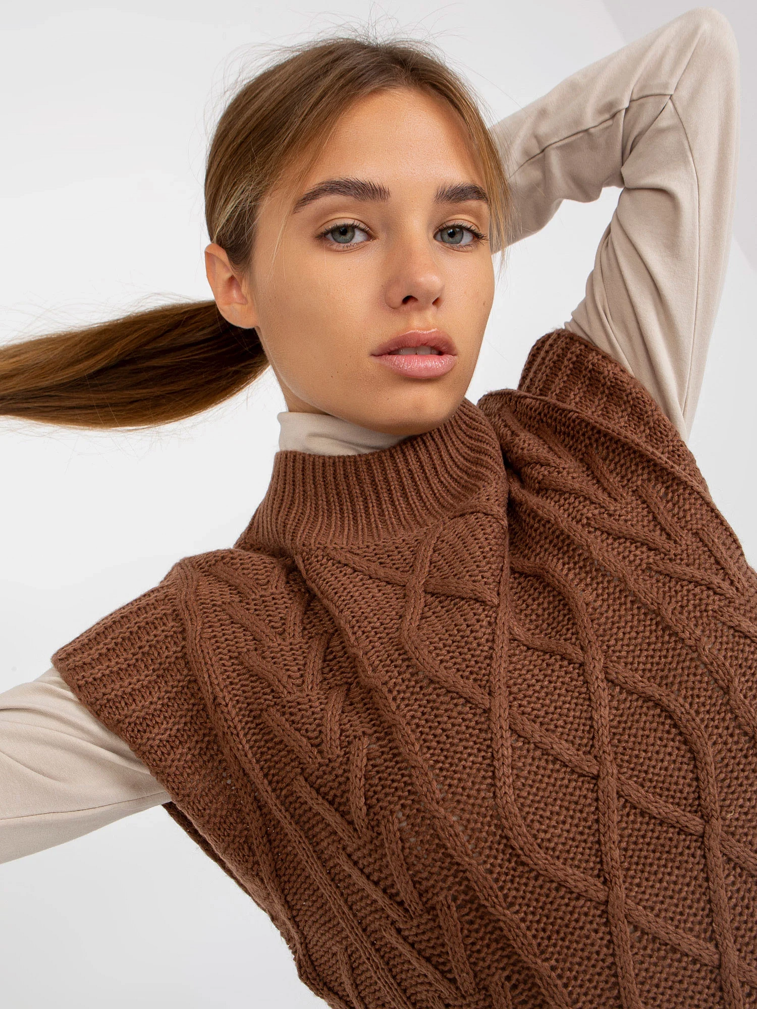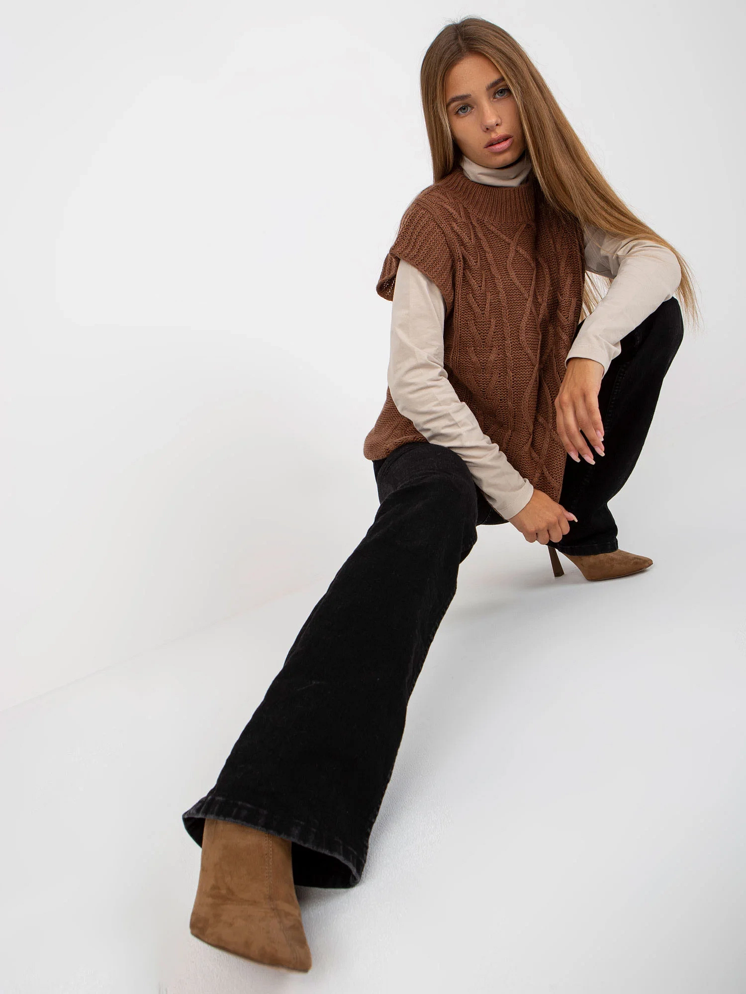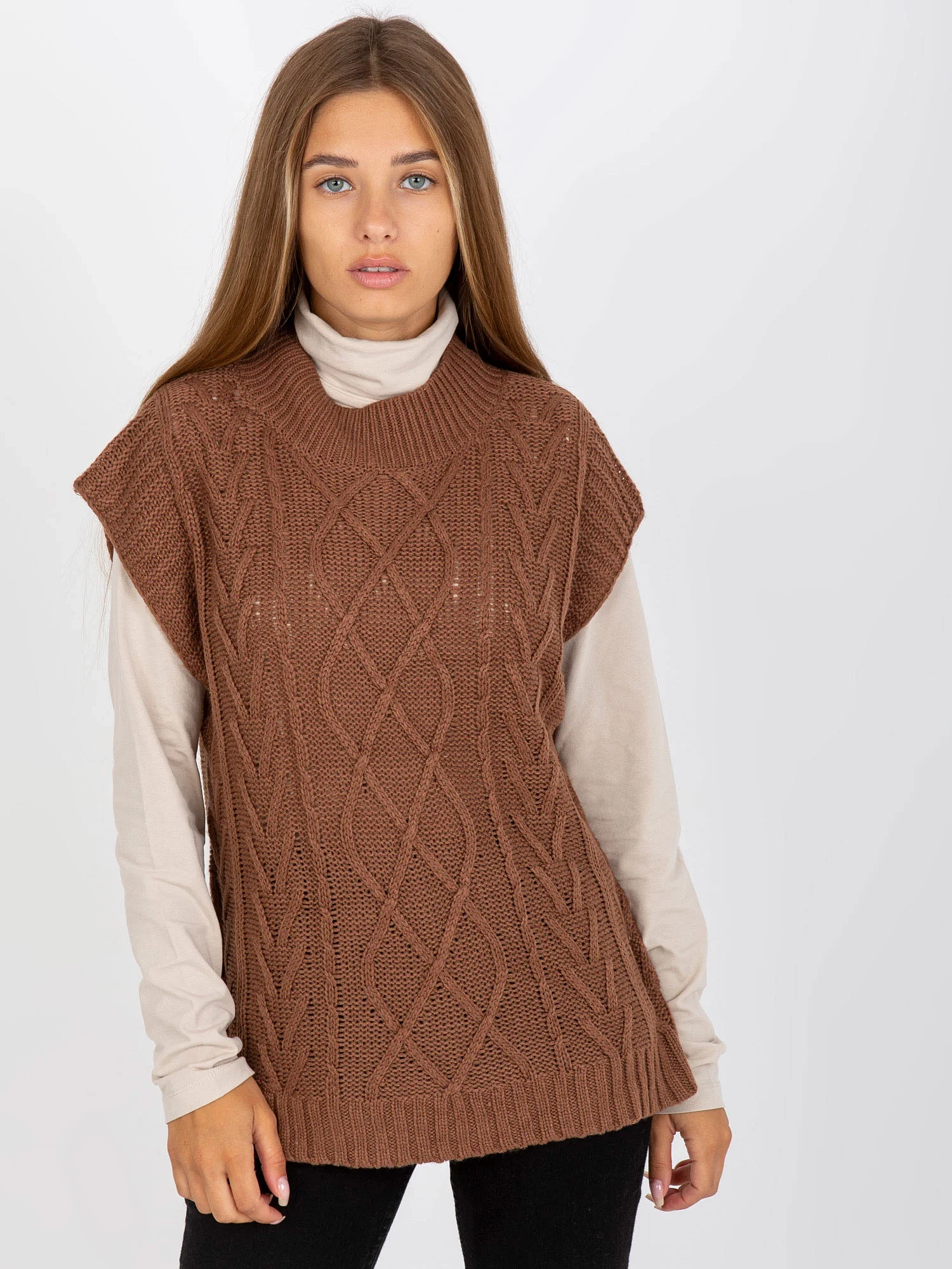 Hnědá pletená vesta s prýmky PODLAHA .