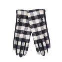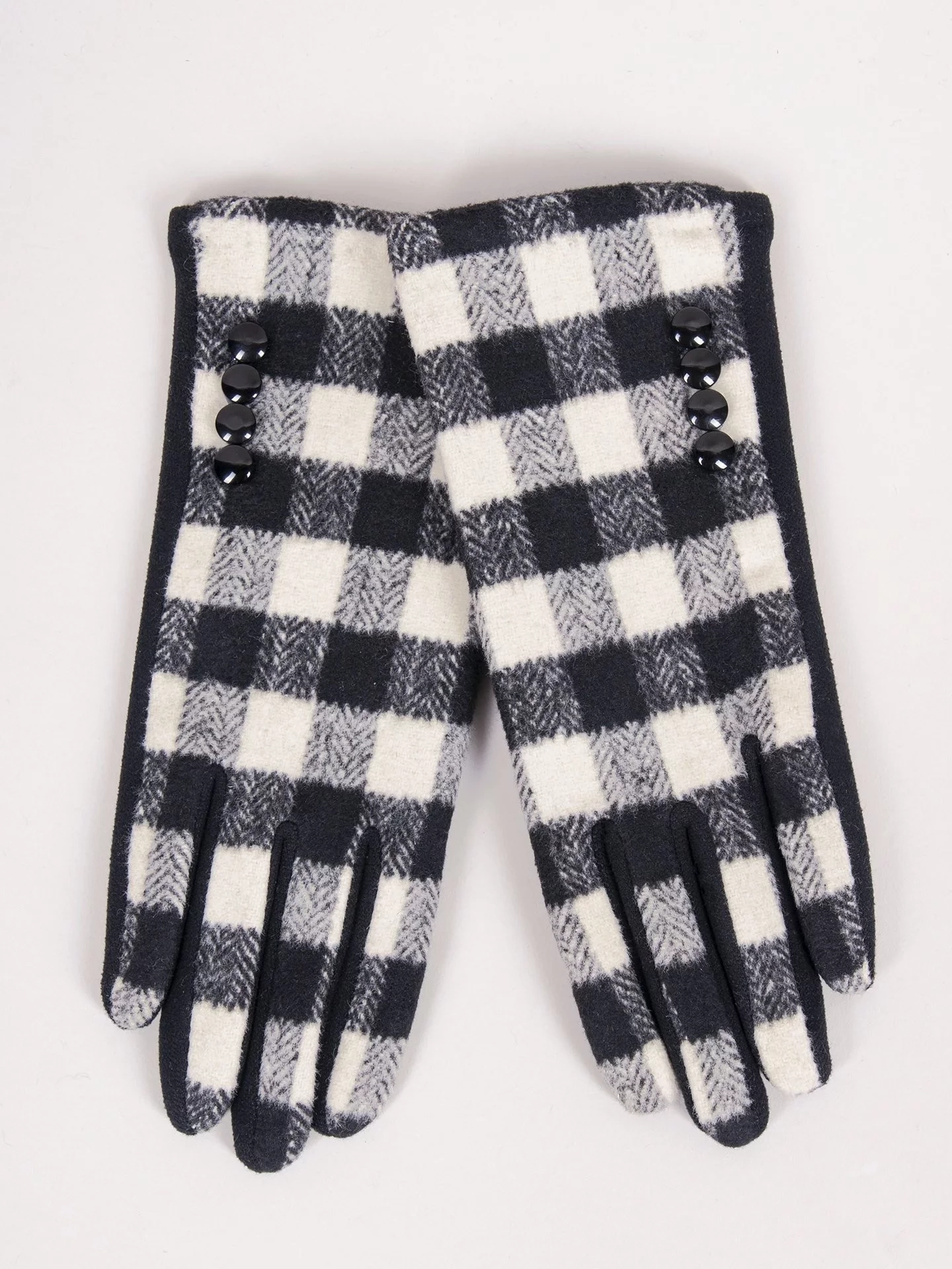 Elegantní, ženské rukavice. V bílé a černé barvě. Ideální pro každodenní i elegantní styling. S kostkovaným vzorem na horní části a ozdobnými knoflíky. Materiál vhodný pro dotykové ovládání na konečcích ukazováčků i palců. Pružné pro přiléhavé nošení. Vnitřní strana polstrovaná měkkou tkaninou na dotek.