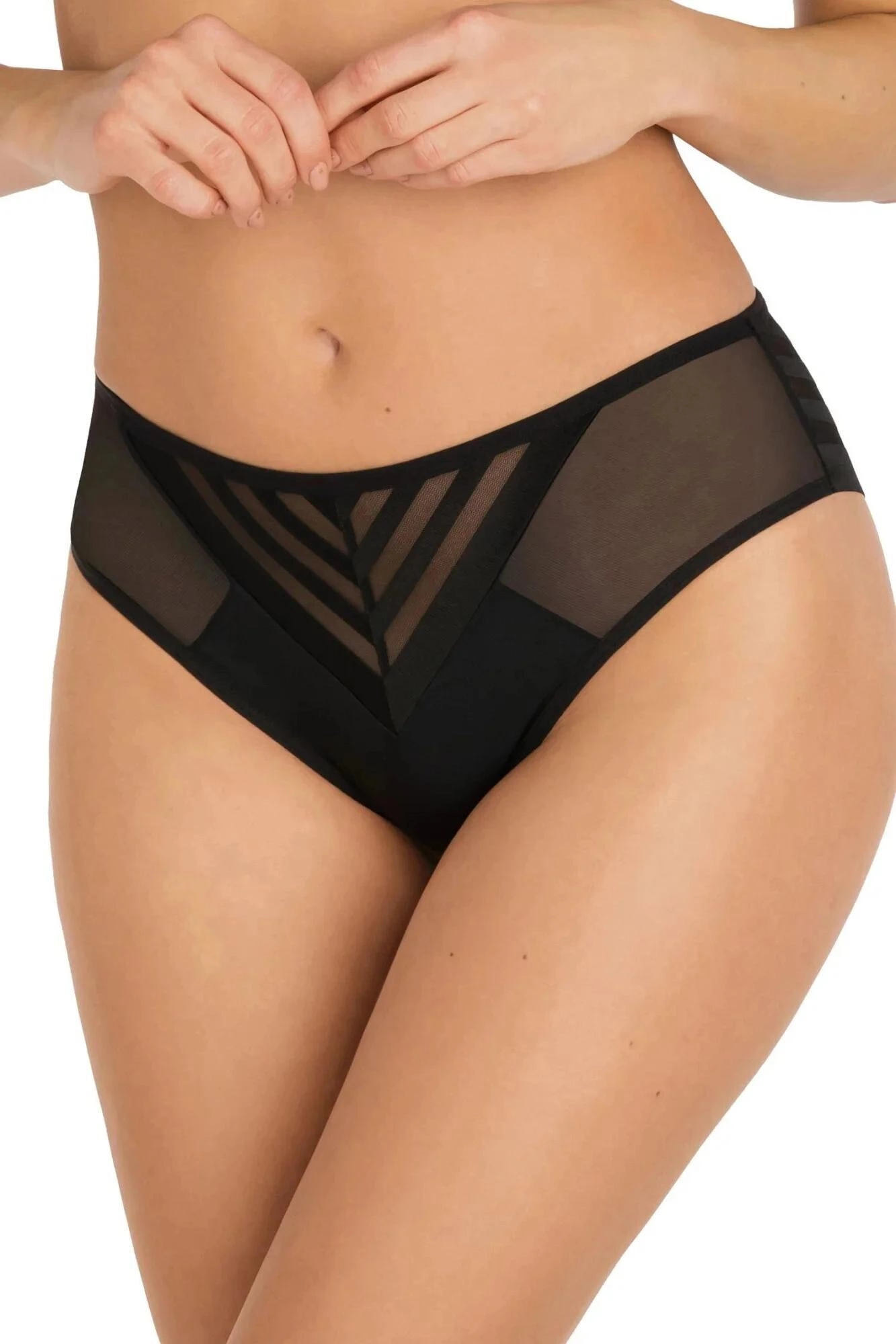Mírně vyšší pas bezpečně obepíná pas a vyhlazuje bříško, čímž vytváří lehkou a proporcionální siluetu. Přední část zdobí poloprůhledná vsadka s geometrickými pruhy uspořádanými do tvaru "V", které dodávají kalhotám lehkost a elegantně zeštíhlují boky.